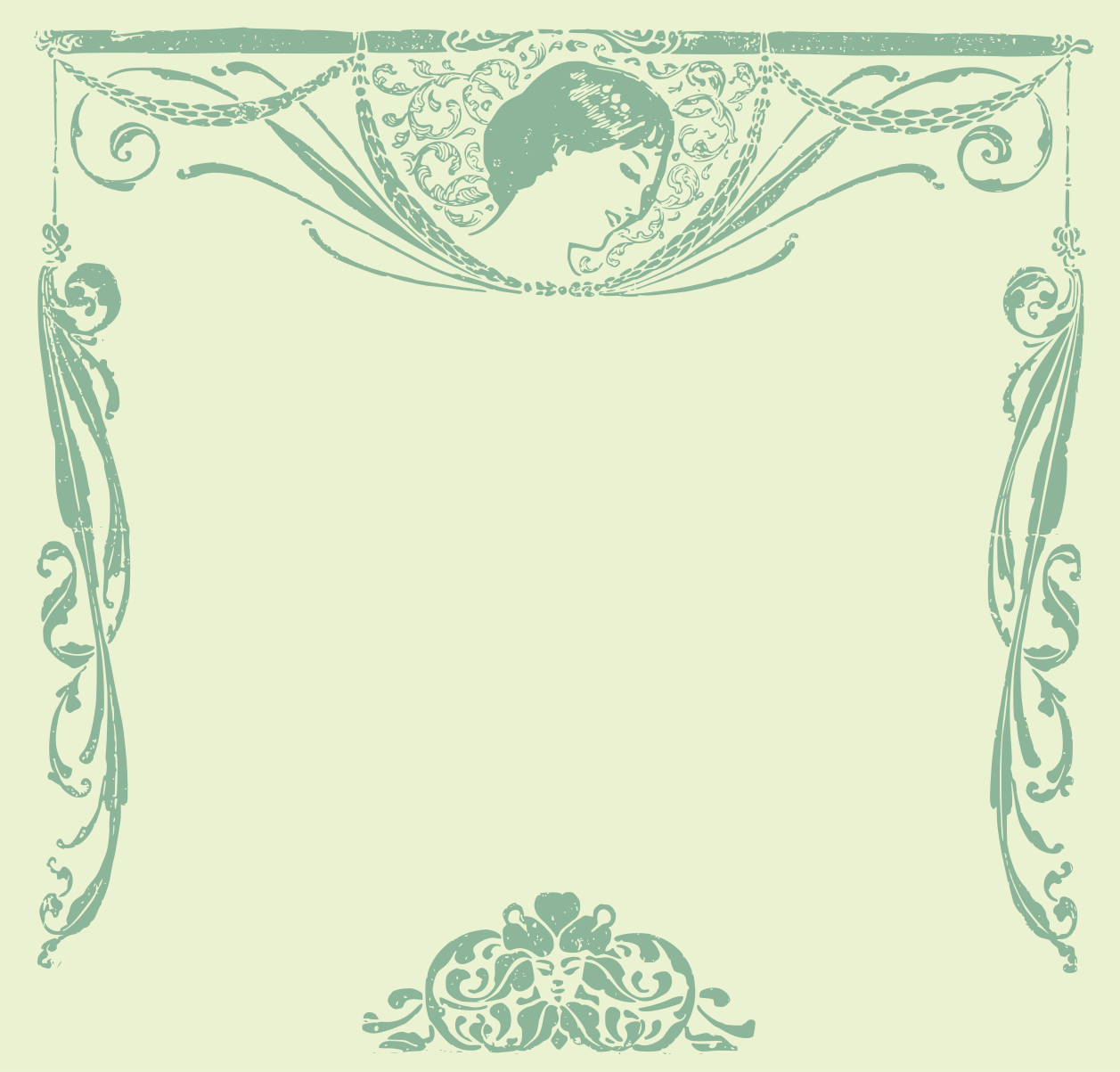 This features a green frame with an ornate design, including swirls and intricate patterns. In the center of this frame is a picture of a woman's face, which appears to be a portrait or drawing. The overall effect creates a visually appealing and artistic display.