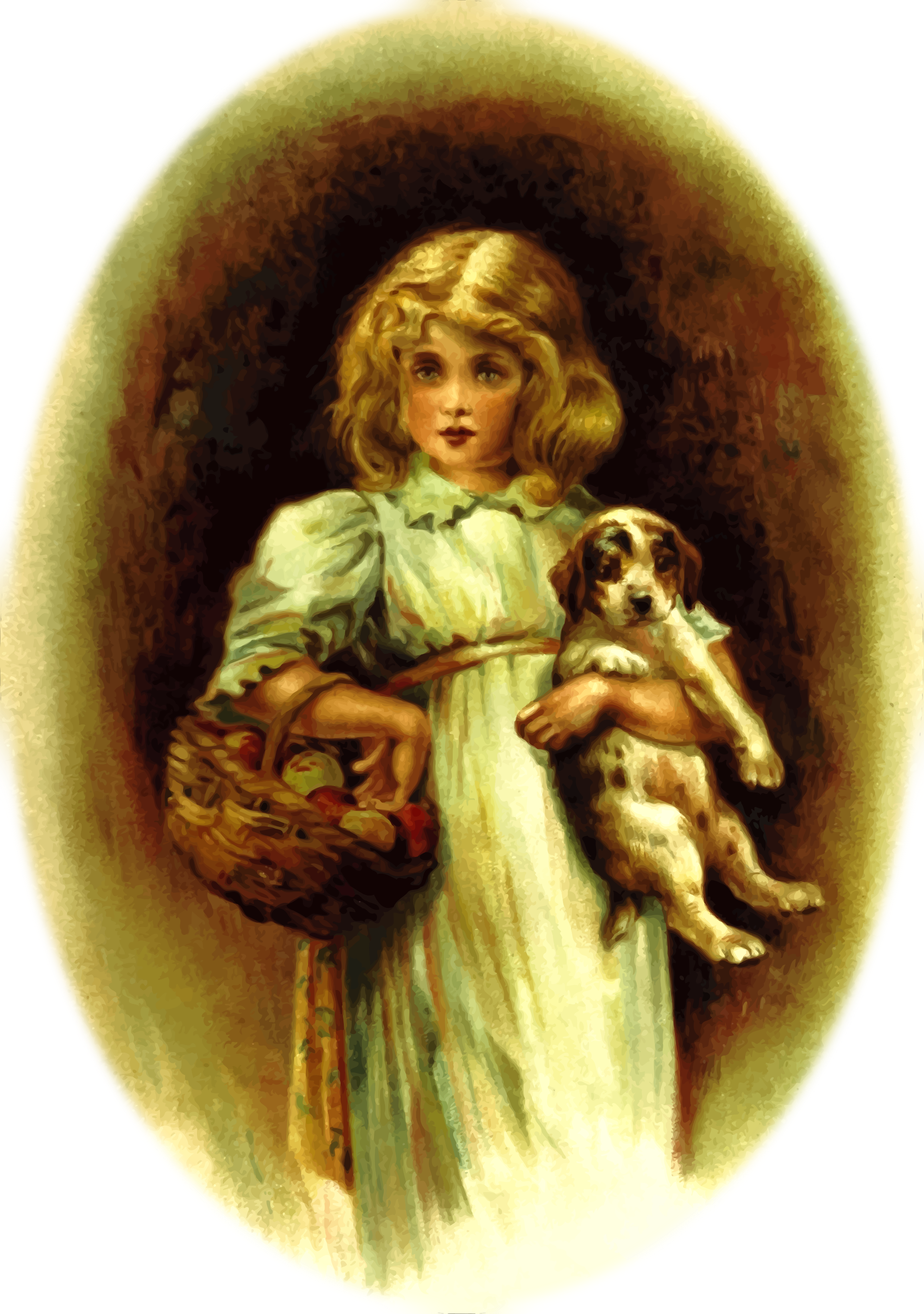 This features a young girl holding a basket of fruit and a small dog in her arms. She is dressed in a white dress, which adds to the overall charm of the scene. The girl appears to be posing for a picture, capturing a moment with her beloved pet. The basket of fruit contains apples, adding an element of freshness and natural beauty to the image. Overall, it's a delightful and heartwarming depiction of a young girl enjoying time with her dog.