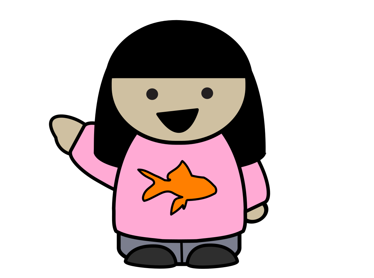 This features a cartoon-like drawing of a woman wearing a pink shirt with an orange fish on it. She is smiling and appears to be waving at the viewer, giving off a friendly vibe. The woman's hair is styled in a bun, adding to her cheerful appearance. In addition to her outfit, she has a pair of blue jeans that complement her overall look. The cartoon-like style and bright colors make this image visually appealing and engaging for the viewer.