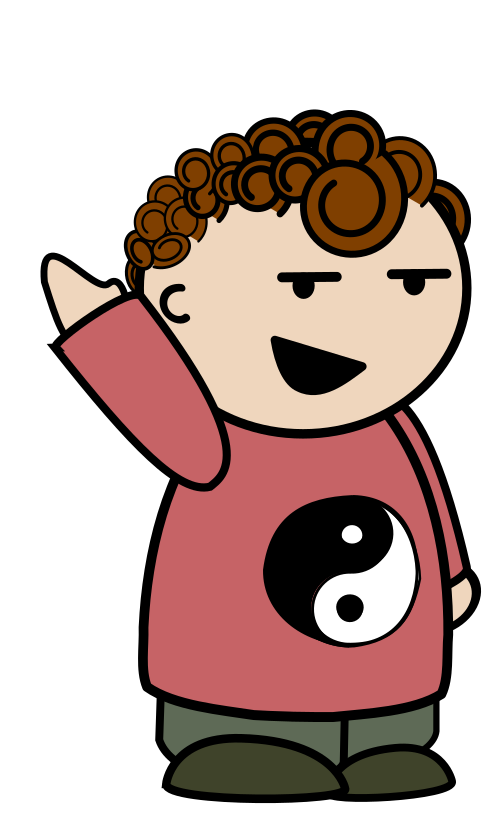 This features a cartoon character with a red shirt and a black yin-yang symbol on it. The character is standing in front of a brown wall, giving the impression that they are posing for a picture. The cartoon character appears to be smiling or making a face, adding a playful element to the scene.
