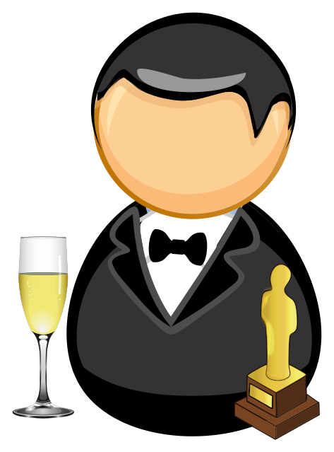 This features a cartoon-like character dressed in formal attire, wearing a tuxedo and bow tie. He is holding a glass of champagne in his hand, giving the impression that he has just won an award or is celebrating a special occasion. The character appears to be standing next to a statue, which could represent the award he has received. The overall scene gives off a sense of accomplishment and sophistication.