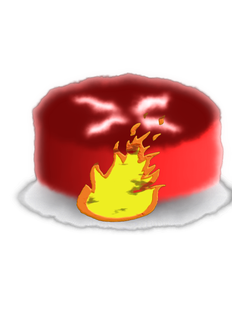 This features a cake with flames on top, giving it an appearance of being burned. It is placed on a white surface, which contrasts the red color of the cake. The cake has a fire design on it, making it look like it's burning or catching fire. This creative presentation could be used for various occasions such as birthdays or other celebrations where a unique and eye-catching centerpiece is desired.