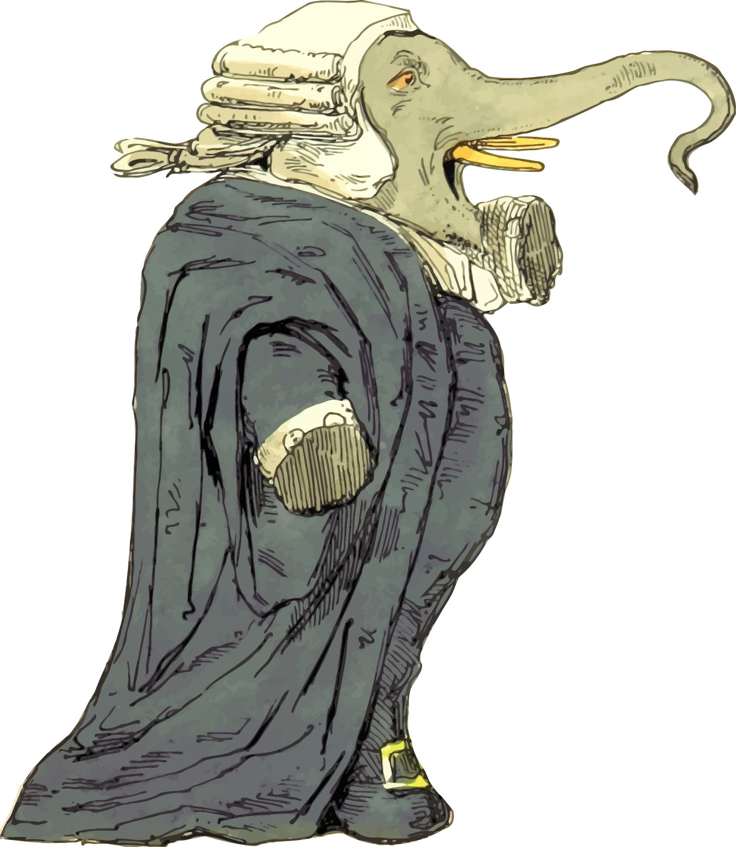 This features a unique and whimsical character, dressed in a black robe with a white collar. This character is an elephant wearing a wig and holding a trunk in its mouth. It appears to be standing on two legs, giving it the appearance of a human-like figure. The elephant's attire adds a touch of humor and creativity to the scene, making it stand out as a distinctive piece of art or illustration.