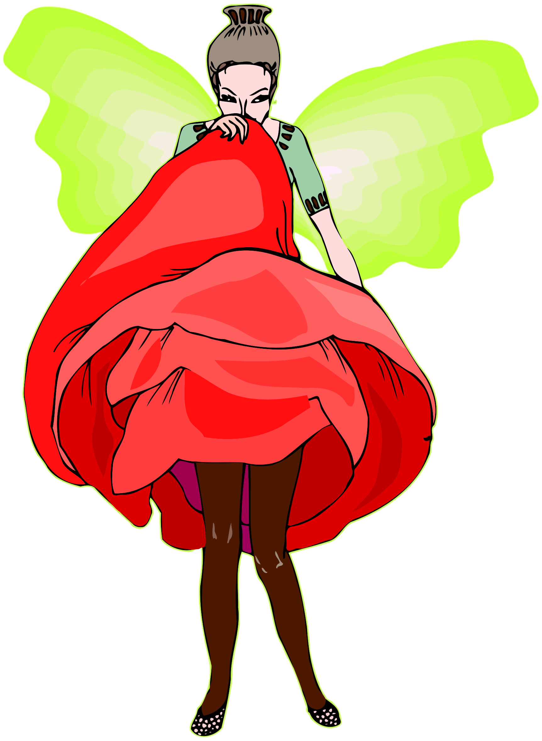 This features a woman dressed as a fairy, wearing a red dress and holding a red blanket. She is standing in front of a green background with her arms wrapped around the blanket. The woman appears to be looking downward while holding the blanket. The scene has a whimsical and imaginative feel to it, capturing the essence of fairy tales and fantasy.