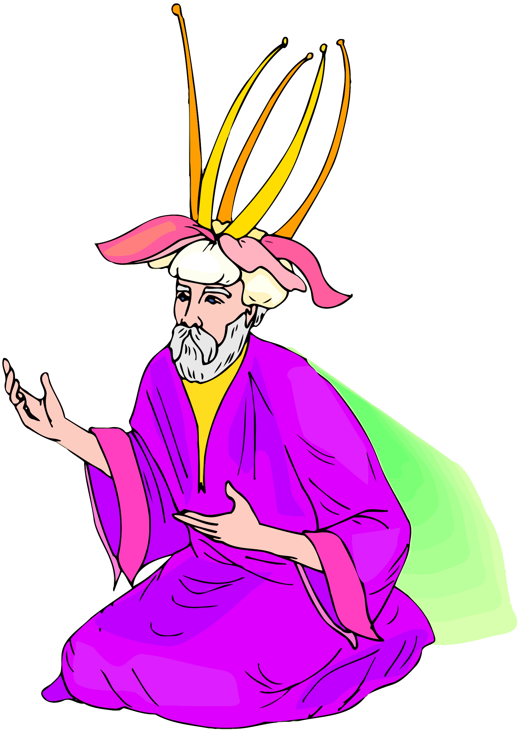This features a man wearing a purple robe and a hat with yellow horns on top. He is sitting down, possibly in a meditative or contemplative position. His beard appears to be white, adding an element of wisdom to his appearance. The man's outfit suggests that he might be a religious figure or someone who values spirituality.
