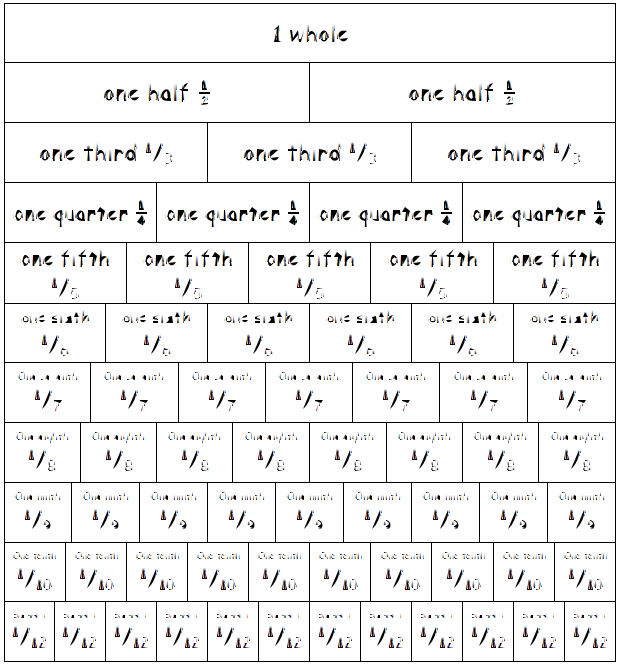 This displays a chart with various numbers and fractions. There are multiple rows of numbers, including one that reads "one whole" and another row that says "one third." Additionally, there is a row labeled "one fourth," "one fifth," and so on. This chart appears to be designed for educational purposes, helping students understand the relationship between numbers and fractions. The chart is organized in a way that makes it easy to follow and comprehend the concepts being taught.