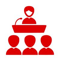 This features a woman giving a speech at a podium, with her silhouette in red. She is standing on top of a box, which serves as the platform for her speech. There are several other people watching her speak, and their silhouettes are also in red. These individuals appear to be attentive and engaged in the presentation. The scene conveys an atmosphere of public speaking or a gathering where important announcements are being made.