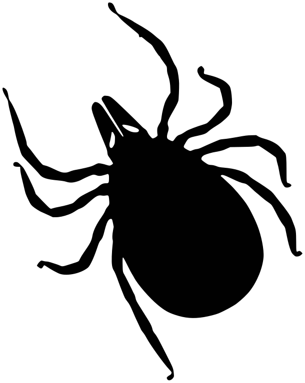 This features a black and white drawing of an insect, possibly a spider or tick. It is depicted in silhouette form with its legs spread out, giving it a menacing appearance. The insect's body occupies most of the frame, while its legs extend towards the edges of the image. This artistic representation captures the essence of the insect and creates an intriguing visual effect.