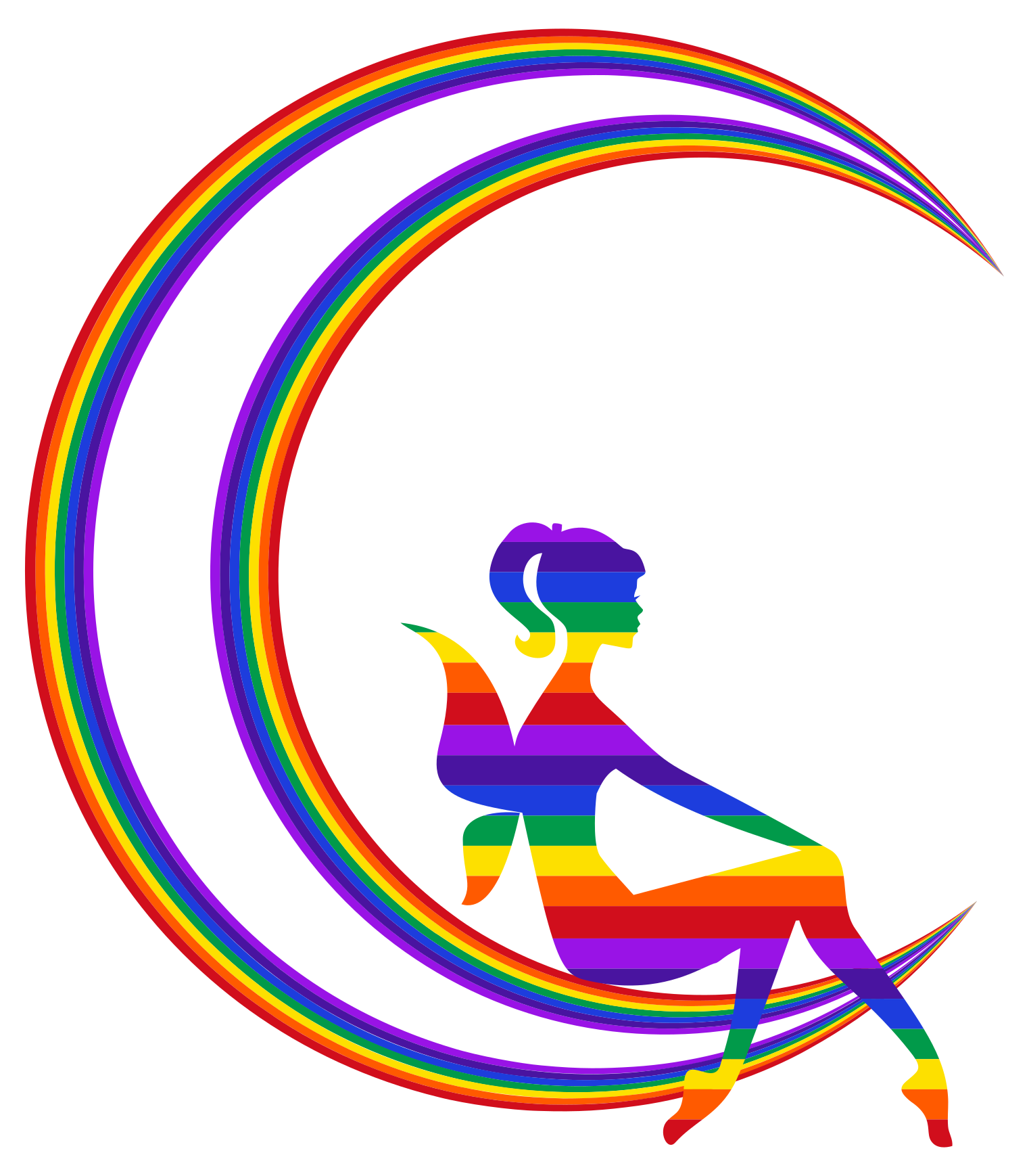 This features a colorful and whimsical scene of a woman sitting on top of a rainbow crescent moon. She is wearing a dress that has an orange, pink, purple, blue, green, yellow, and red hue to it. The woman appears to be enjoying her time as she sits in the middle of the vibrant circle. The combination of the woman's outfit and the rainbow crescent moon creates a visually appealing and imaginative image that captures the essence of creativity and artistic expression.