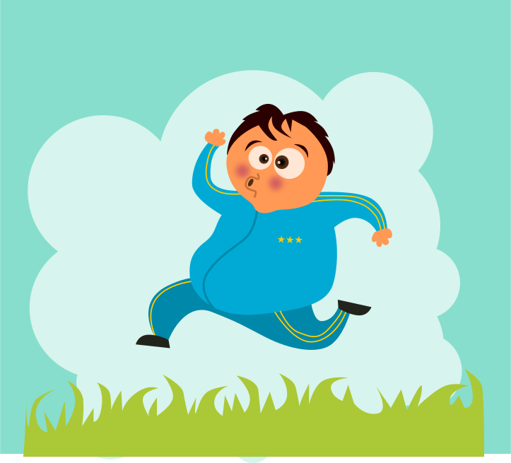 This features a cartoon of a man running through the grass, wearing blue clothing. He appears to be in motion and is quite large, giving him an exaggerated appearance. The scene takes place on a cloudy day, adding to the overall atmosphere of the image. The man's outfit suggests that he might be dressed for sports or exercise, as he runs through the field with determination.