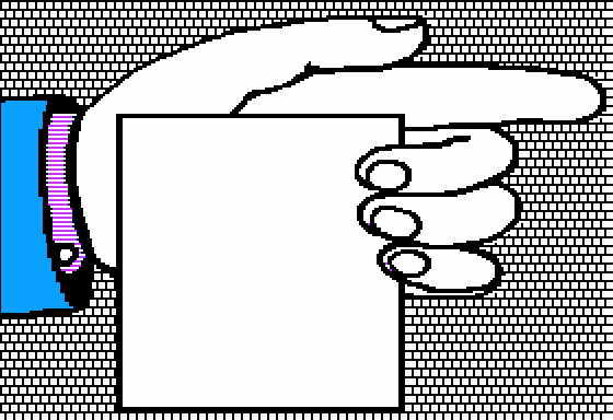 This features a hand holding a piece of paper, pointing towards the right side. The hand is wearing a blue sleeve and appears to be in motion as it points at the paper. The paper itself is square-shaped and occupies a significant portion of the scene. This could be an illustration or a graphic design element within a larger image or composition.
