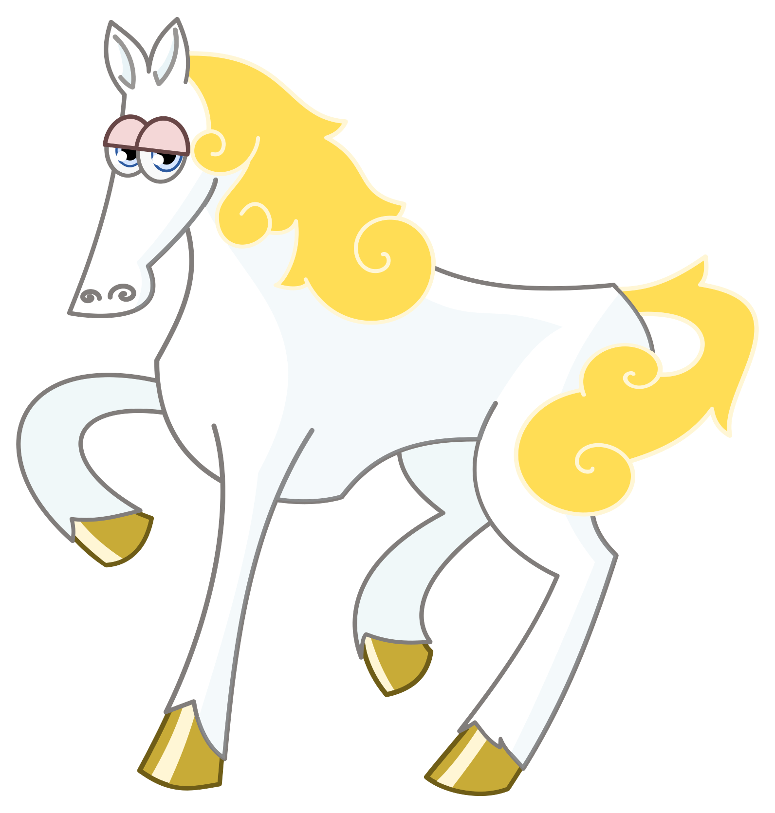 This features a white cartoon horse with yellow hair and gold hooves. It appears to be walking or running, as it is captured in motion. The horse's eyes are wide open, giving the impression that it might be surprised or startled. Its overall appearance is quite unique and eye-catching due to its combination of white and yellow colors with the gold hooves.