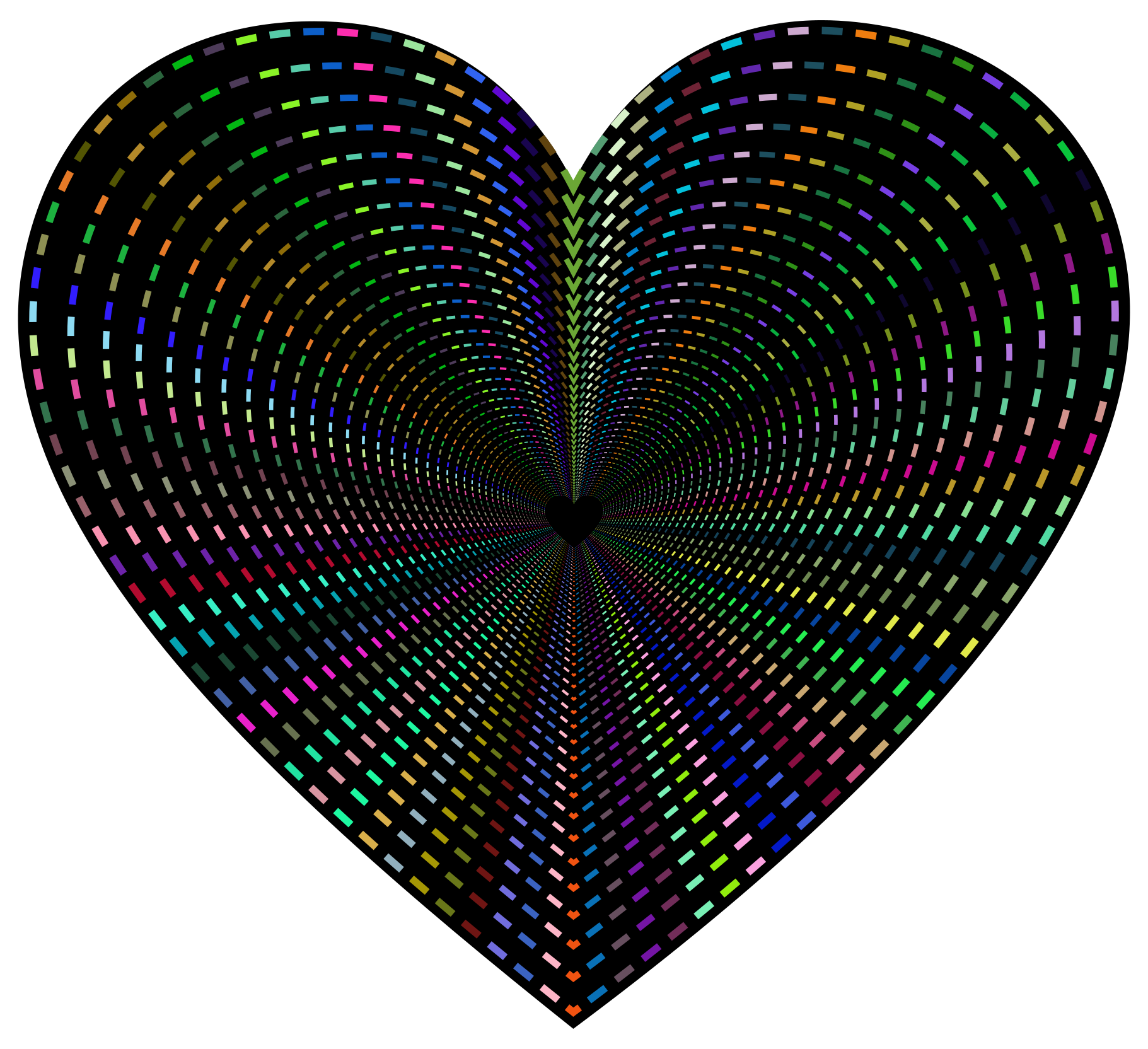 This features a heart-shaped tunnel with a black background. Inside the tunnel, there are colorful walls that create an eye-catching and vibrant visual effect. The tunnel appears to be made up of many small circles or dots, which together form the heart shape. This unique design gives the impression of being inside a kaleidoscope, with the colors blending and creating a mesmerizing pattern.