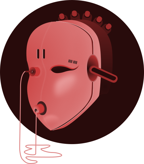 This features a red mask with two small holes for eyes and a large hole in the center, which is plugged into its mouth. This unique design gives it an eerie appearance. The mask appears to be made of plastic or rubber, giving it a slightly flexible texture. It seems like a creative piece of art or a prop from a science fiction movie.