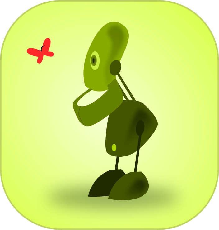 This features a green robot with no hands, standing in front of a yellow background. It appears to be watching a red butterfly that is located towards the left side of the scene. The robot's posture suggests it might be leaning forward or bending down slightly. The overall composition creates an interesting and unique visual experience for viewers.