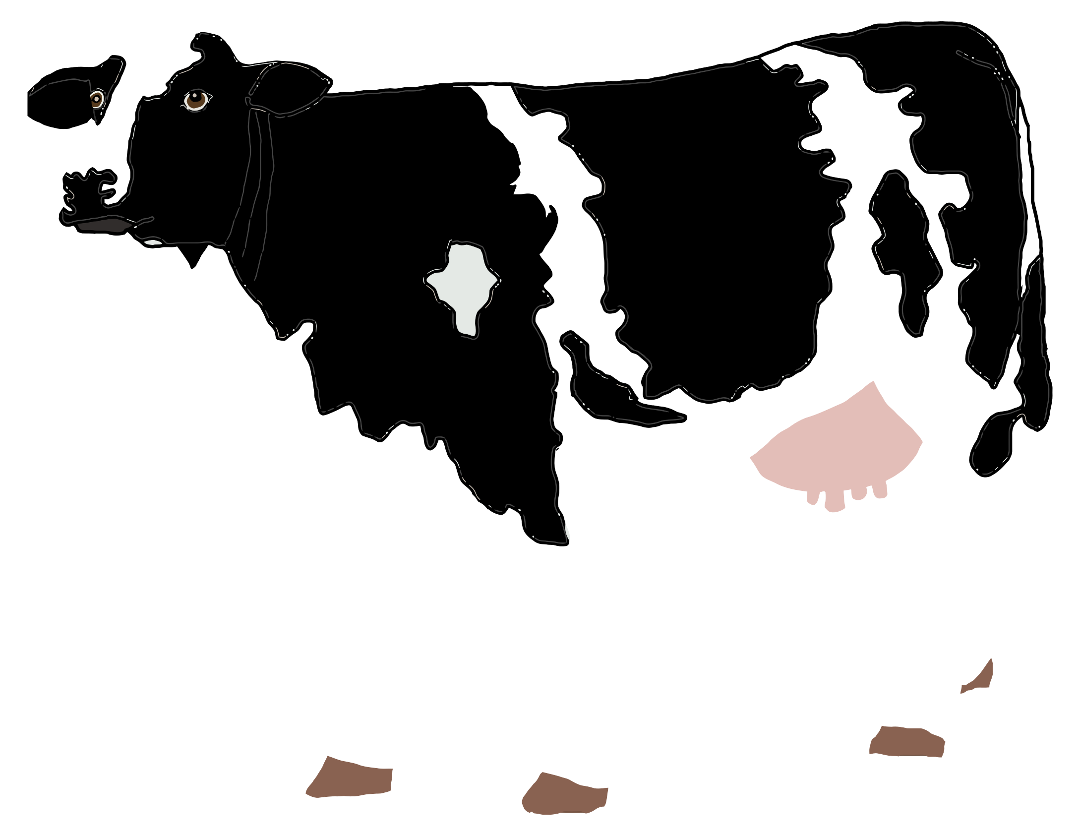 This features a large black and white cow standing on a surface. It appears to be an illustration or drawing of the cow, with its body taking up most of the frame. The cow's head is turned slightly to the left, giving it a more dynamic pose. Its legs are spread out, providing a sense of scale and depth to the image. Overall, the cow seems to be the main focus of the picture, capturing attention with its size and unique coloration.