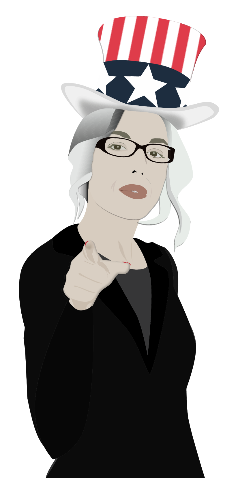 This features a woman wearing a patriotic hat, which is shaped like an American flag. She has glasses on and is pointing her finger at the camera. Her outfit consists of a black suit jacket, adding to the professional appearance. The overall scene appears to be a creative and fun representation of the iconic character Aunt Samantha from Pixabay.