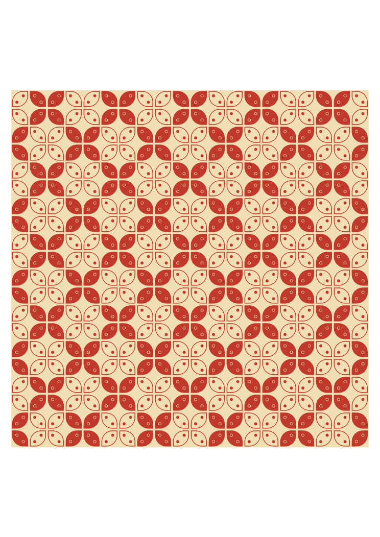 This features a square with an intricate and colorful design. The pattern is made up of various shapes, including circles and diamonds, which are arranged in a visually appealing manner. These shapes are combined to create a unique and eye-catching design that stands out against the background. The colors used in this design include red, orange, and tan, giving it a warm and inviting appearance. Overall, the square showcases an artistic and creative approach to pattern making.