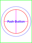 This features a red circle with a blue border, which has the words "push button" written in white. Inside the circle is a pink cross mark, possibly used for drilling purposes or to locate the center of the button. The overall size of the button is 28mm in diameter, and it appears to be a push button design.