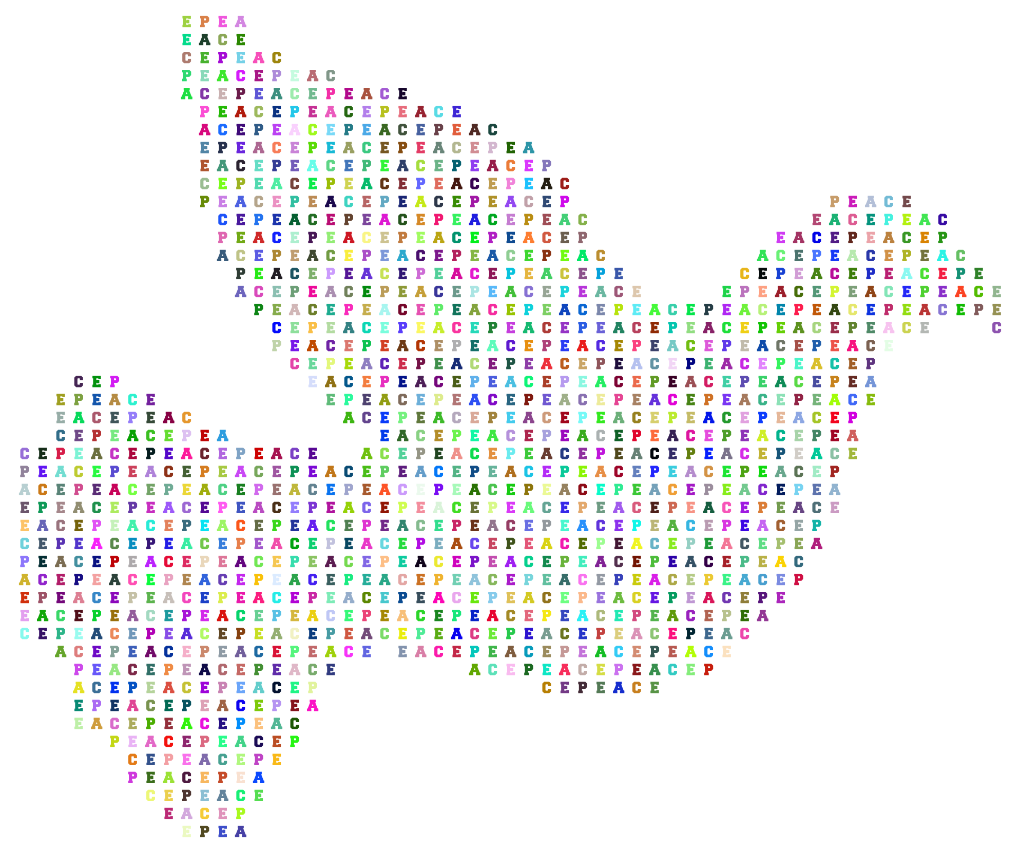 This features a dove made up of various letters and numbers, creating an artistic and visually appealing design. The dove is composed of multiple smaller doves, each one made from different letter combinations. These individual doves are scattered throughout the scene, with some placed closer to the center while others are positioned towards the edges. The overall effect of this composition is a unique and creative representation of peace through typography. The use of letters and numbers in place of traditional dove shapes adds an interesting twist to the concept, making it both visually engaging and thought-provoking. This artistic approach showcases the artist's ability to transform ordinary text into a captivating visual experience.