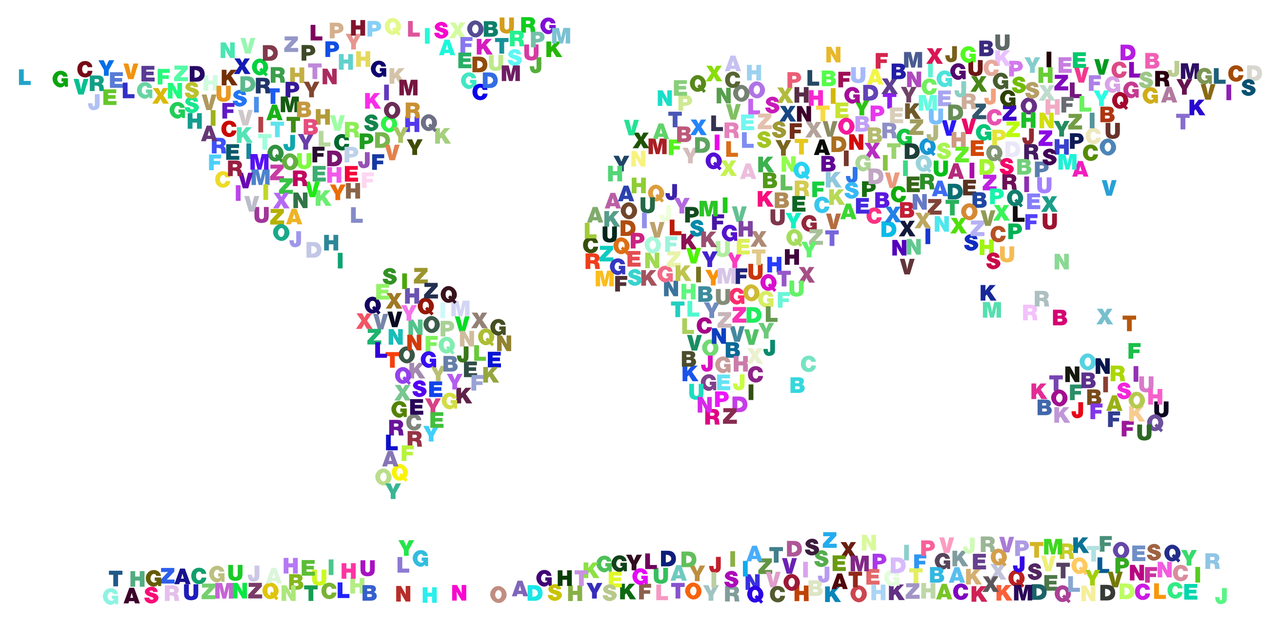 This is a unique and creative representation of the world map, where each country has been assigned a letter from the alphabet. This artistic approach to geography showcases the diversity of countries across the globe in an unconventional manner. The letters are arranged on top of the map, with some overlapping or partially obscuring the country names beneath them. The image is quite large and spans almost the entire width of the frame. It features a diverse range of countries from different continents, including Europe, Asia, Africa, North America, South America, Australia, and Antarctica. The letters are colorful and vibrant, adding an artistic touch to the map while still maintaining its geographical context. This innovative representation of the world map is both visually appealing and thought-provoking.
