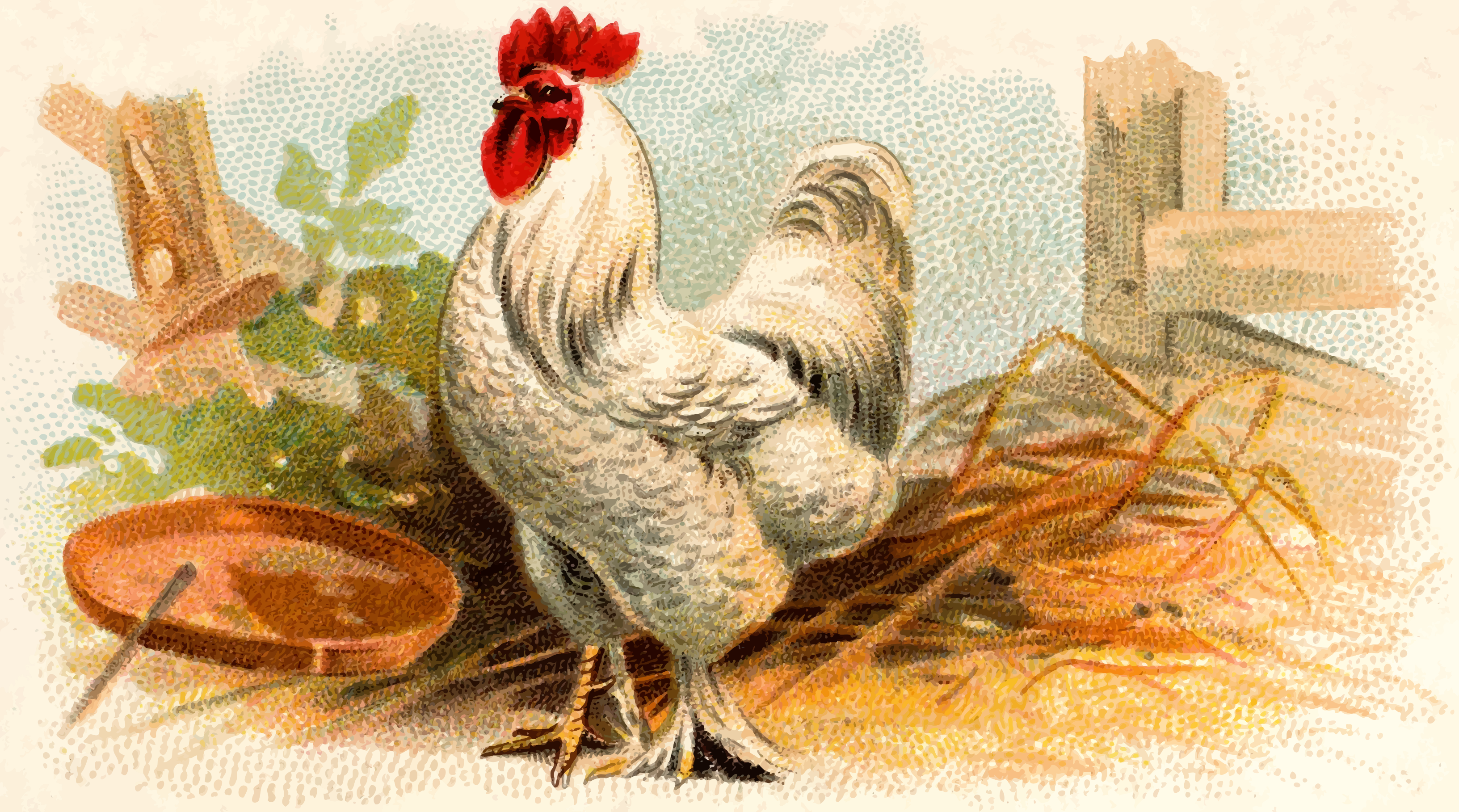 This features a rooster standing in an outdoor setting, surrounded by hay and plants. The rooster is positioned near the center of the scene, with its head turned to the left. In addition to the main rooster, there are two other birds visible in the background, one on the right side and another further back on the left. A bowl can be seen placed towards the left side of the image, possibly containing food for the birds. The overall scene gives off a rustic vibe with the presence of hay and plants.