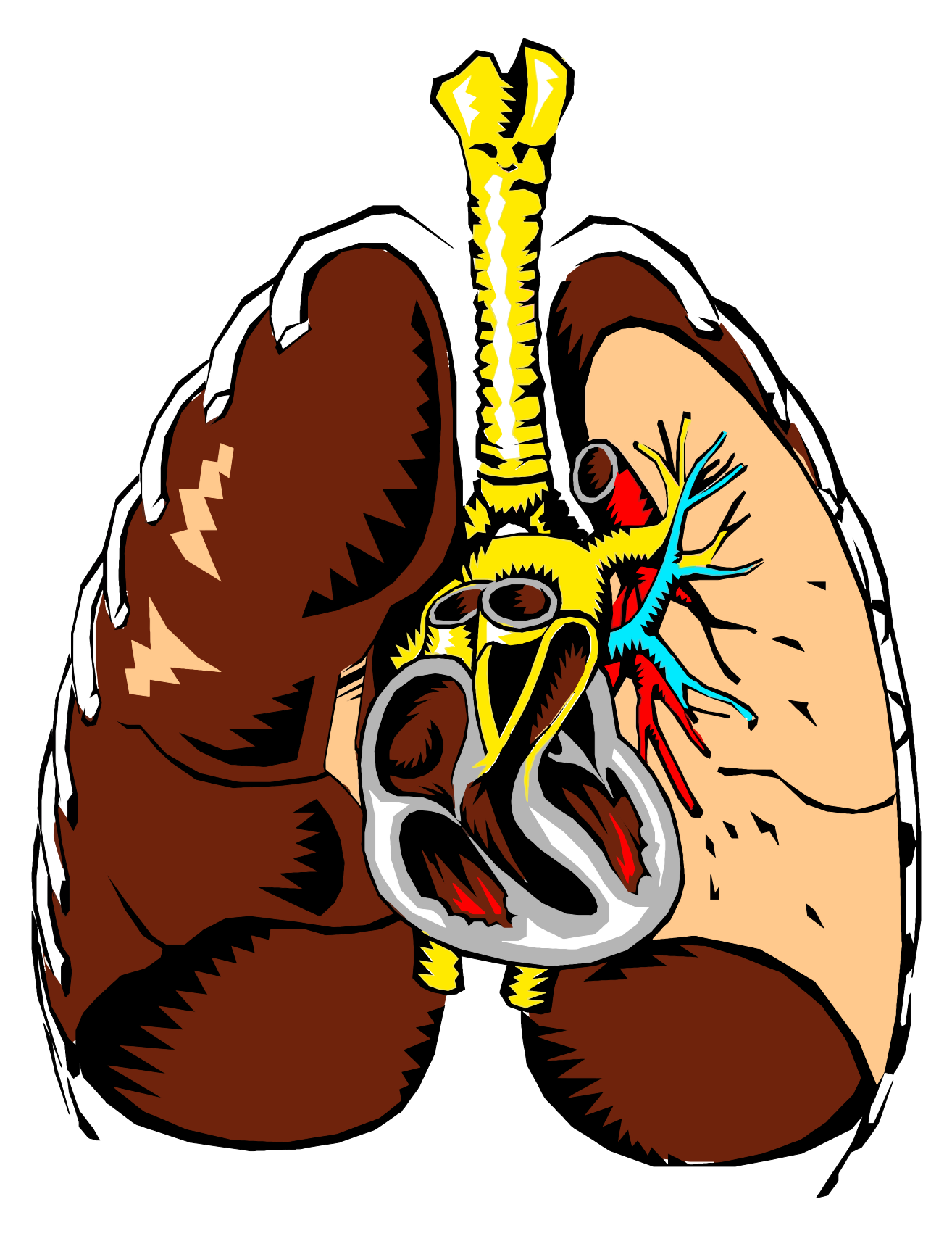 This features a colorful drawing of the human heart and lungs. The heart is prominently displayed in the center, surrounded by various blood vessels that branch out to different parts of the body. The lungs are shown on the right side of the image, with their branches extending towards the top left corner. The drawing also includes a detailed representation of the ribcage, which surrounds and protects the heart and lungs. This ribcage is visible in various positions throughout the image, including the bottom left, middle, and top right areas. The overall composition of the drawing showcases the intricate structure and functioning of these vital organs within the human body.