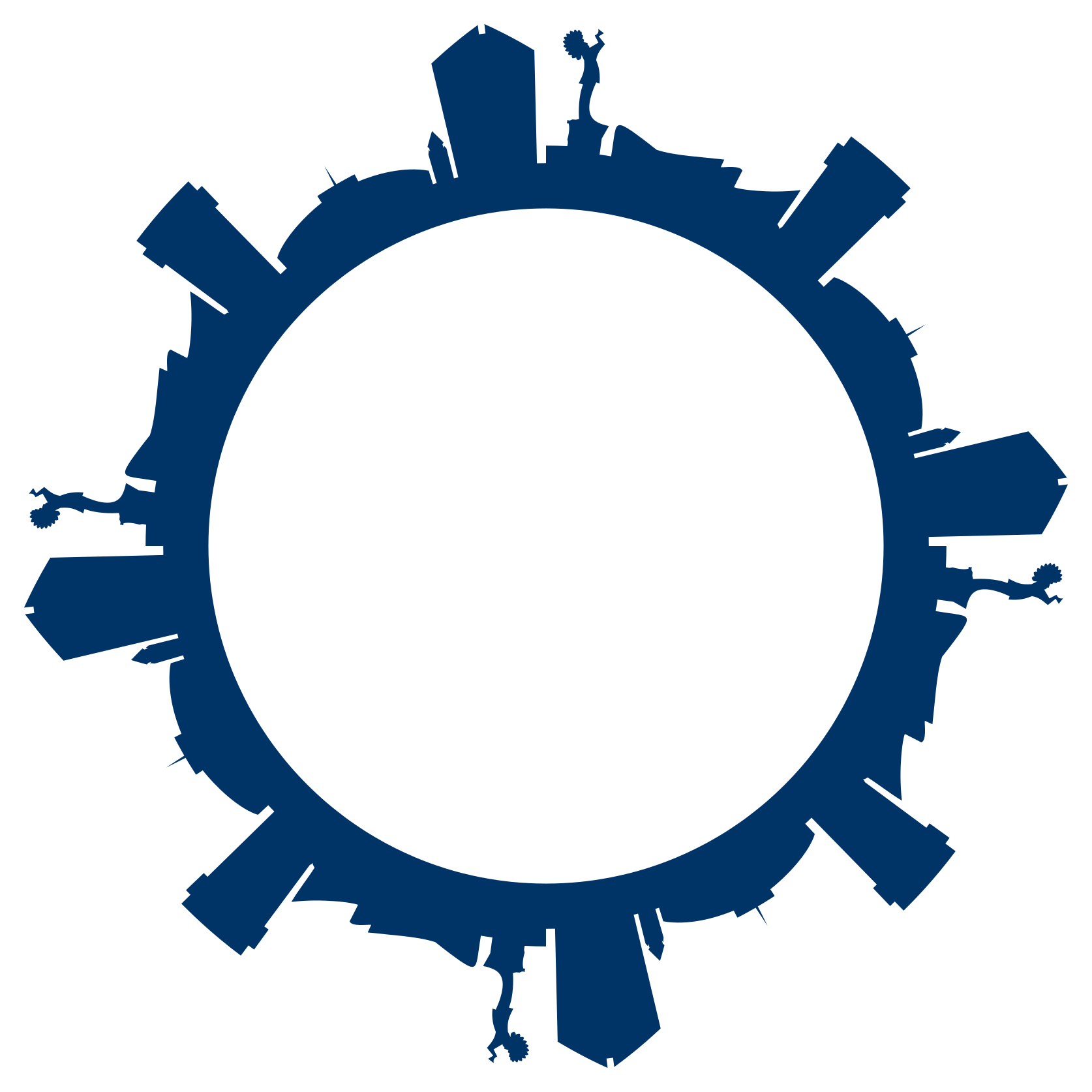 This features a blue and white circular design that resembles a city skyline. The skyline is composed of various buildings, including some tall towers, which are scattered throughout the scene. There are also several smaller structures visible in the background, adding depth and detail to the overall composition. The circular shape of the image gives it an artistic and unique appearance, making it stand out as a creative representation of a cityscape.