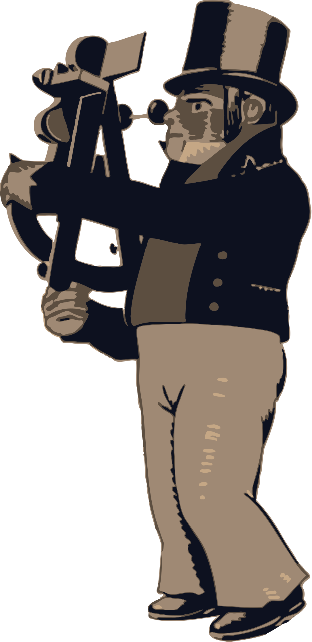 This features a black and white drawing of a man wearing a top hat, holding an accordion. He is standing in front of a wall with the accordion held up to his face. The man appears to be dressed in a suit, giving him a distinguished look. The drawing captures the essence of the character while showcasing his unique attire and instrument.