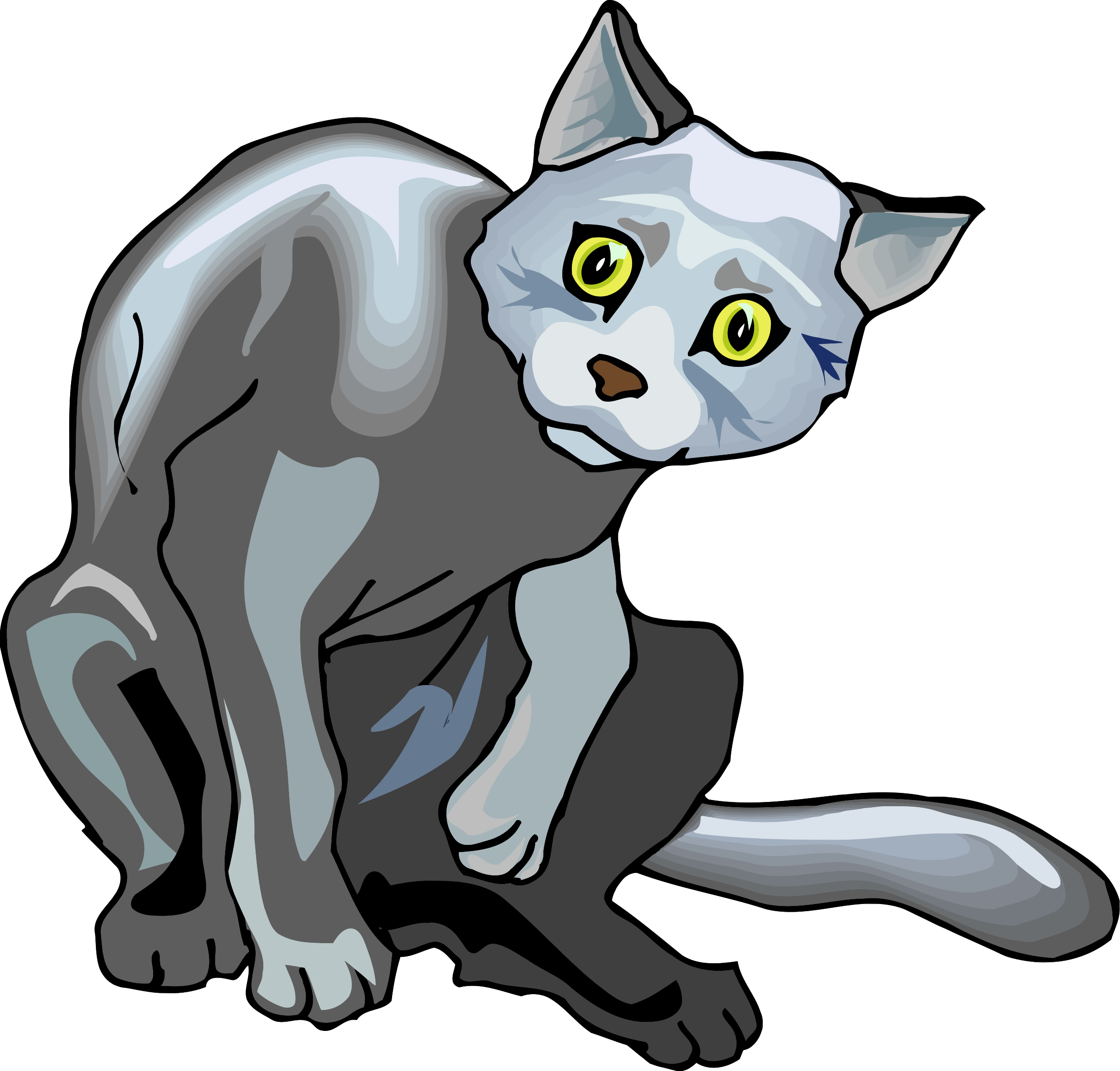 This features a cat with yellow eyes, sitting on the ground and looking up. It appears to be an animated or cartoon-like representation of the feline. The cat's body is positioned in such a way that it seems to be peeking over its shoulder, giving the impression of being playful or curious. The cat's eyes are wide open, drawing attention to its expression and adding to the overall charm of the scene.