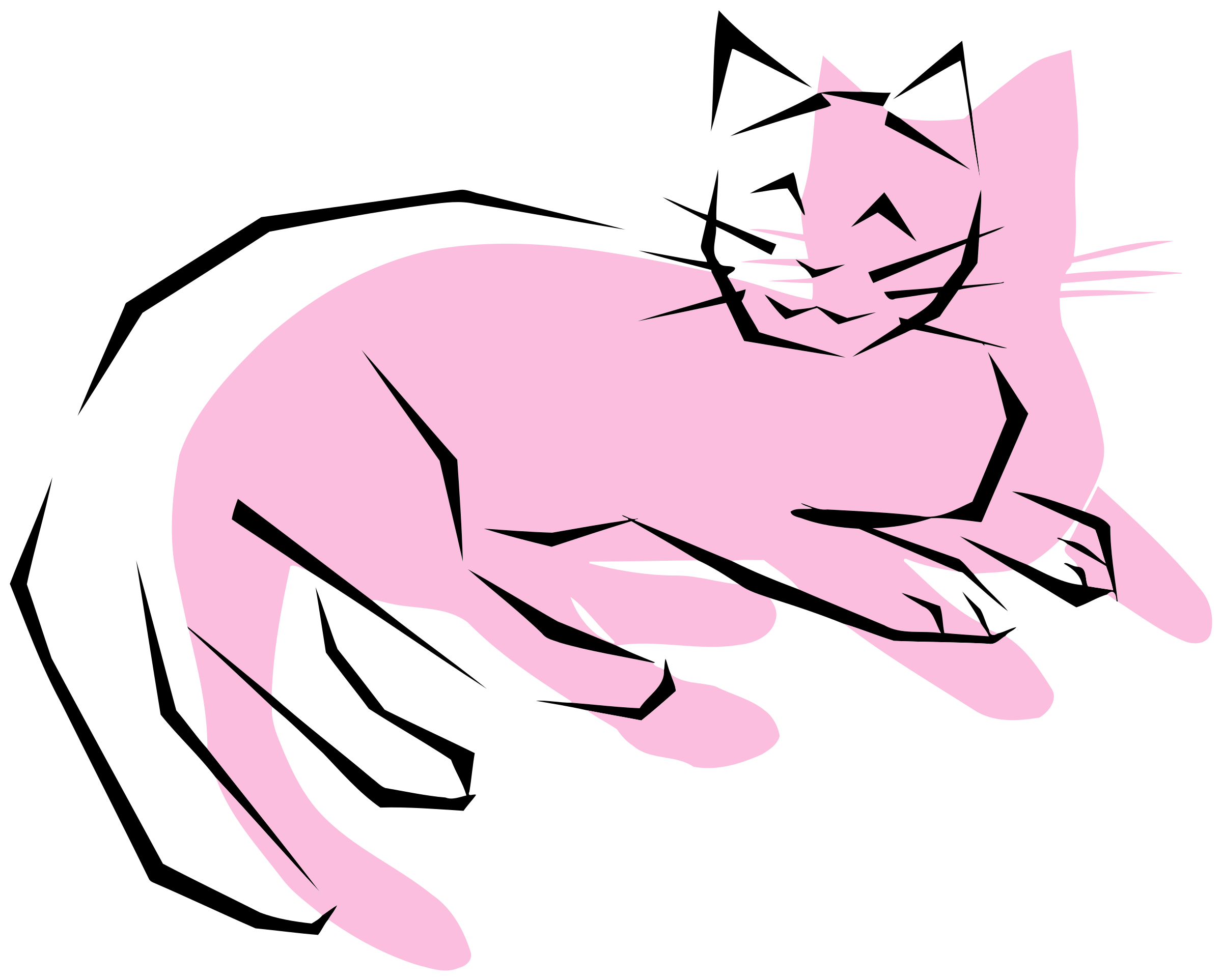 This features a pink cat lying on its side, with one paw raised. It appears to be in a relaxed and comfortable position. The cat's eyes are open, giving it an alert expression. The background of the image is white, which provides a clean and simple backdrop for the cat. Overall, the scene captures a peaceful moment of rest for the feline.