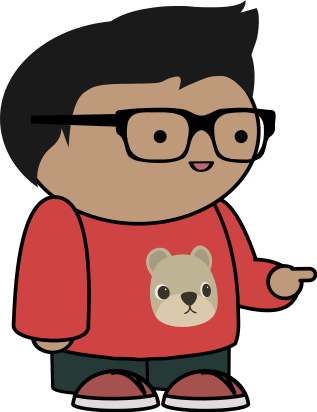 This features a cartoon character wearing glasses and a red shirt. He is pointing his finger towards the right, possibly indicating something interesting or important in that direction. The character appears to be a young man with a playful expression on his face. His outfit includes a red sweater and black pants, giving him a casual yet stylish appearance.