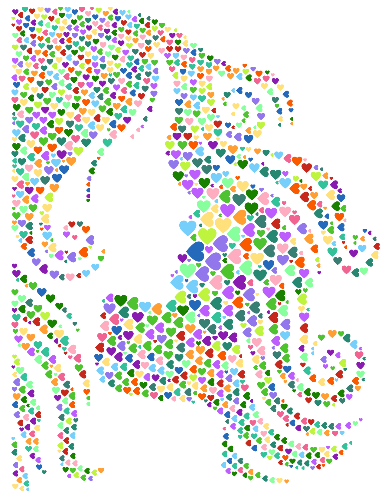 This features a unique and colorful design of a woman's hair profile, with hearts as the main decorative element. The hair is depicted in various colors, including red, green, blue, yellow, and orange, creating an eye-catching pattern. The hearts are scattered throughout the design, adding depth and visual interest to the overall composition. This artistic piece could be used for a variety of purposes such as wall decoration or even as a fashionable accessory.