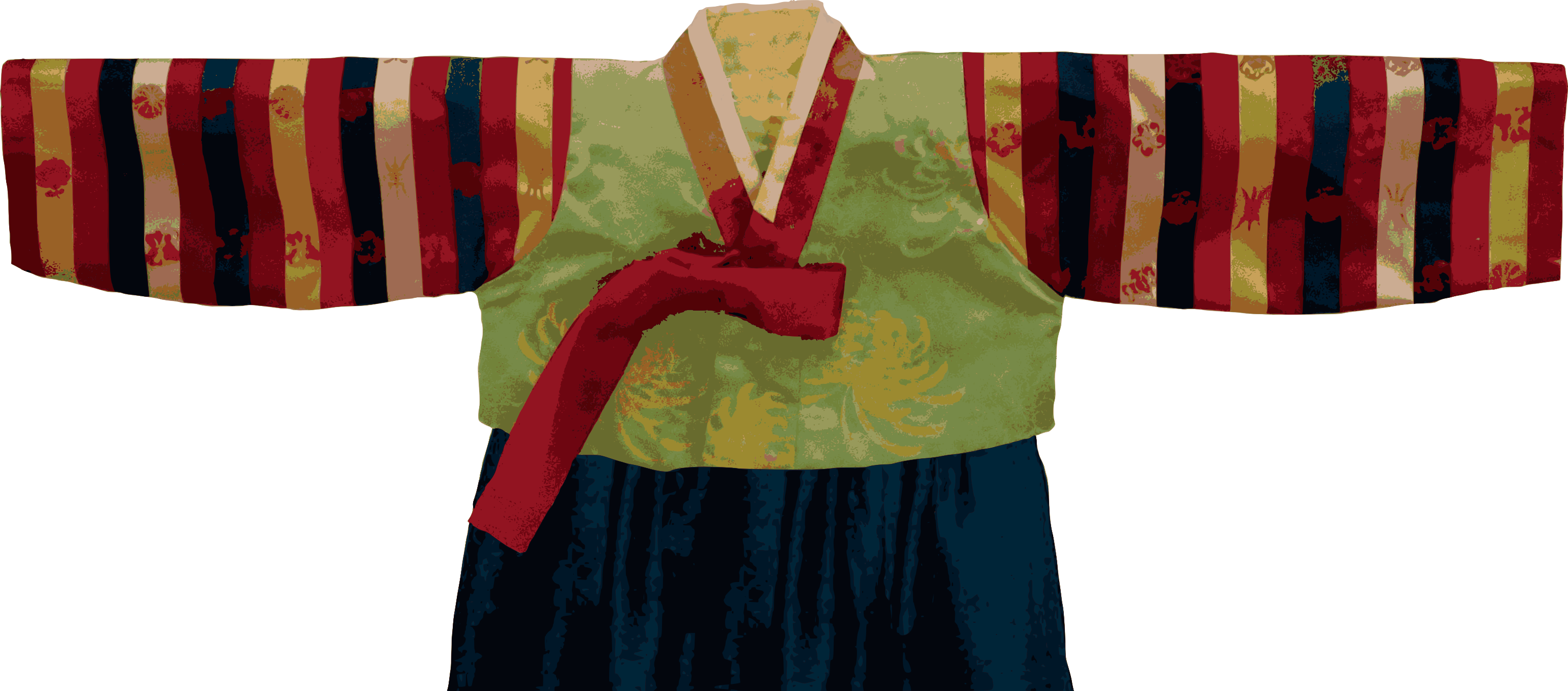 This features a person wearing a traditional Asian outfit, specifically a hanbok. The hanbok is adorned with a red ribbon and has a yellow and orange color scheme. The person appears to be standing in front of a white background, which provides a clean and uncluttered backdrop for the image. The overall appearance of the hanbok suggests that it may have been digitally added or edited to enhance its visual appeal.
