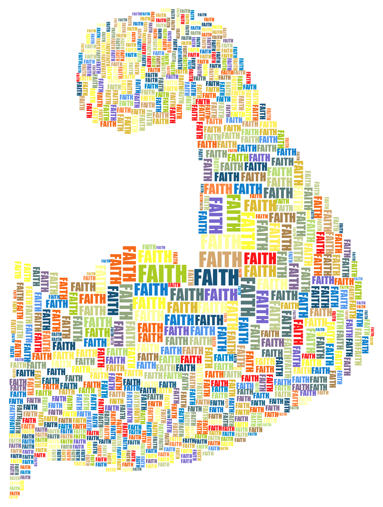 This is a collage of various words and phrases, all related to the theme of faith. These words are arranged in such a way that they form a large muscle, with the word "faith" being prominently displayed at the center. The other words surrounding it include "strength", "believe", "hope", "trust", and "love". This collage is an artistic representation of the power of faith in our lives, emphasizing its importance as a source of strength and inspiration.