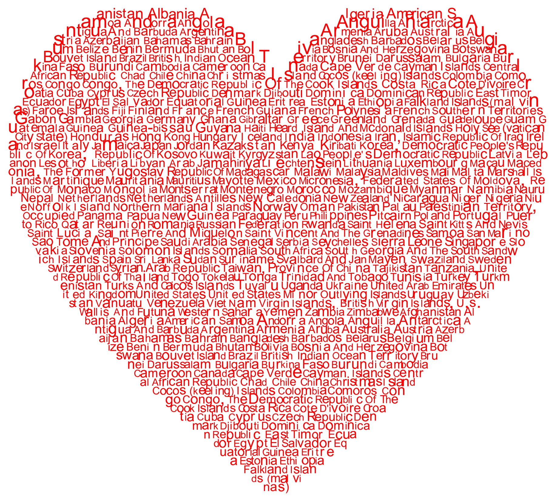 This features a large heart made up of various words, creating an interesting visual effect. The heart is filled with different letters and phrases, making it appear as though the heart itself is composed of these words. This unique display of text creates a striking contrast against the red background, drawing attention to the creative arrangement of the letters.