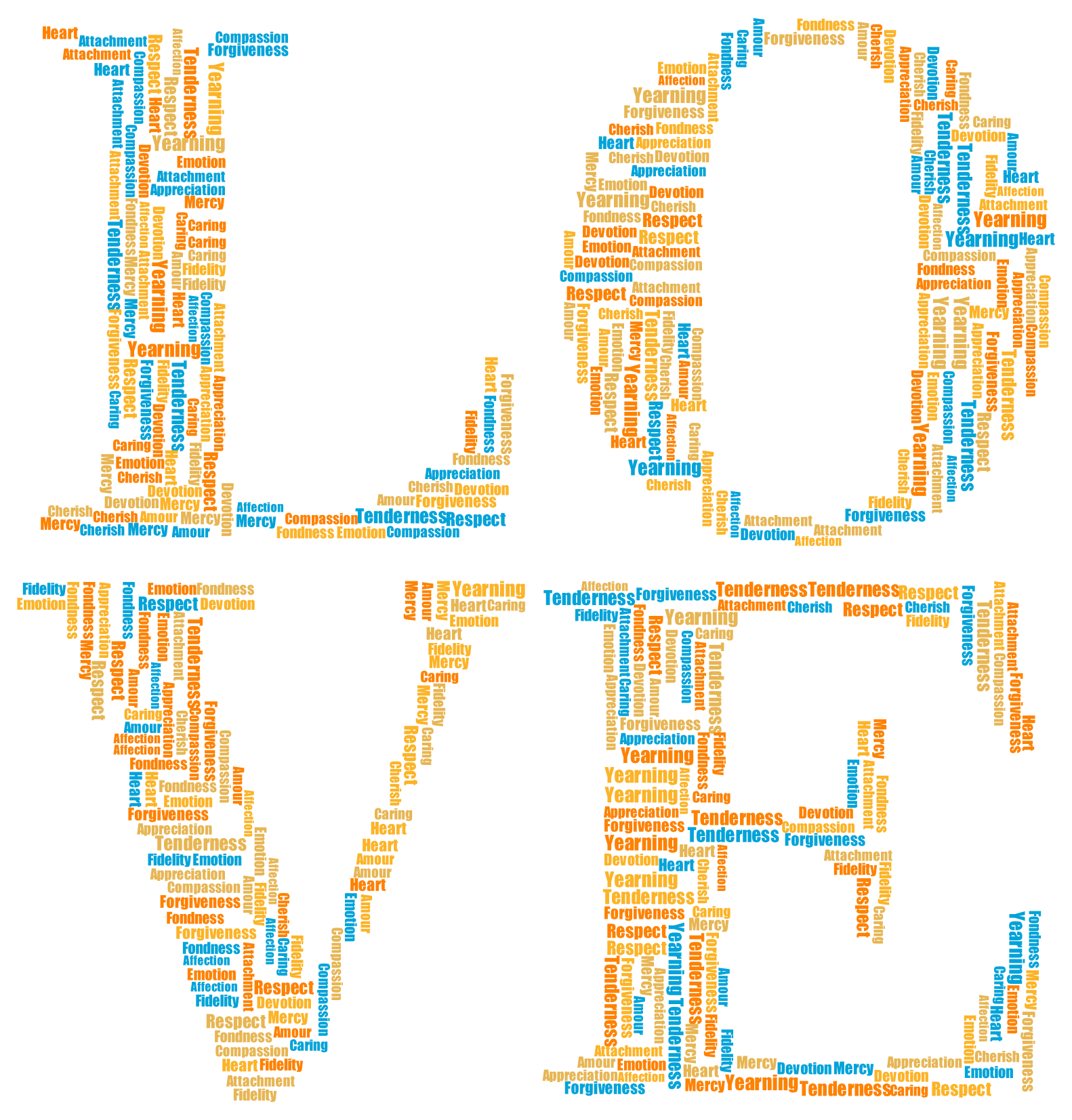This is a word cloud that features the word "LOVE" in various colors and sizes. The word "LOVE" is written in different shades of blue, orange, yellow, and green, creating an eye-catching visual effect. The word cloud is filled with numerous other words related to love, such as "affection," "adore," "cherish," "desire," and "enjoy." These words are scattered throughout the image in various sizes and colors, adding depth and complexity to the overall design.