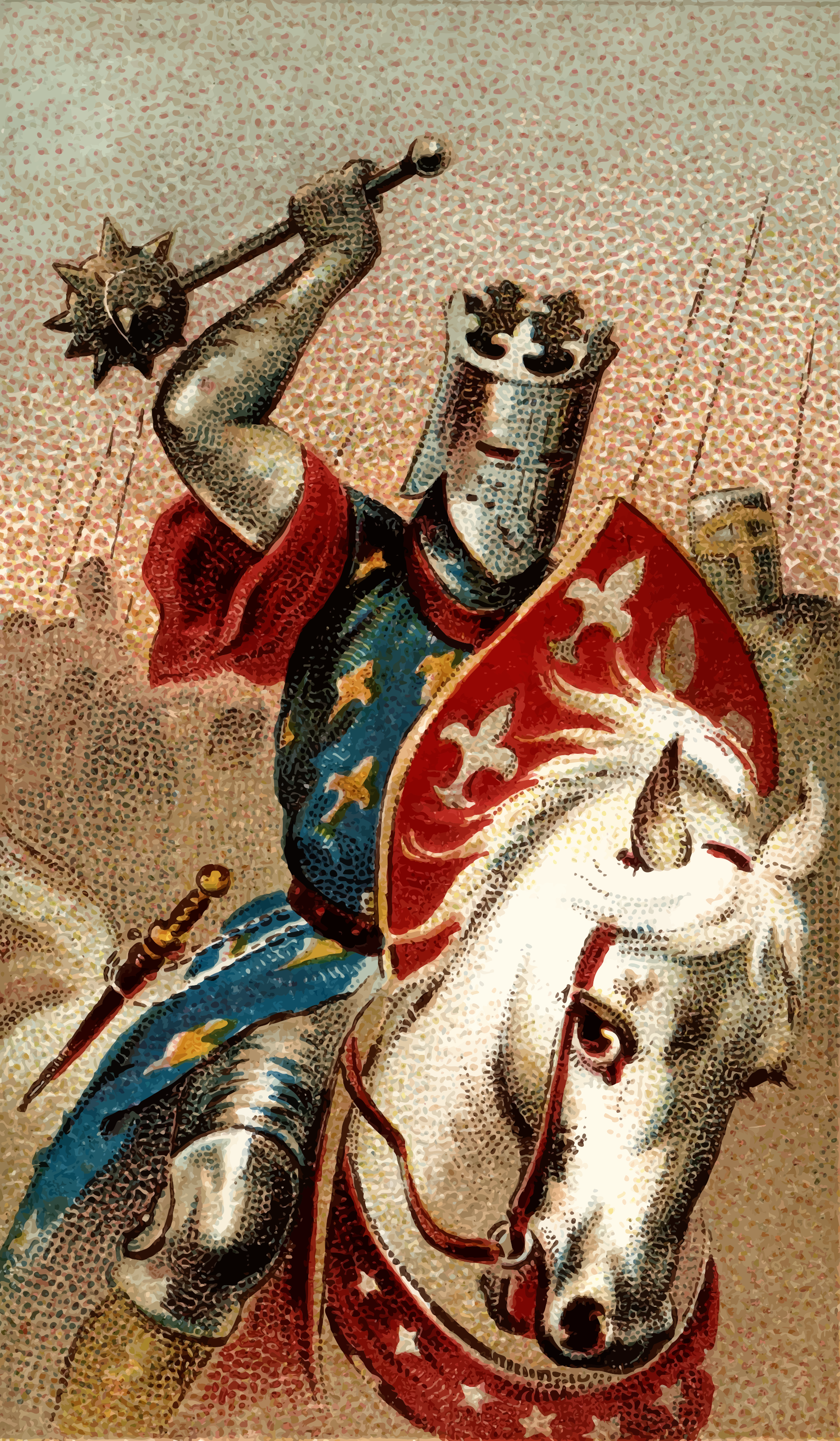 This features a knight in shining armor riding on the back of a white horse. He is holding two swords, one in each hand, and appears to be ready for battle or some other formidable task. The knight's attire includes a blue cape and a red robe, adding to his regal appearance. In addition to the main subject, there are several other people visible in the scene, likely as part of an army or group of warriors. Some of these individuals can be seen holding swords, while others appear to be engaged in various activities. The overall atmosphere suggests a sense of camaraderie and readiness for action among the knights and their companions.