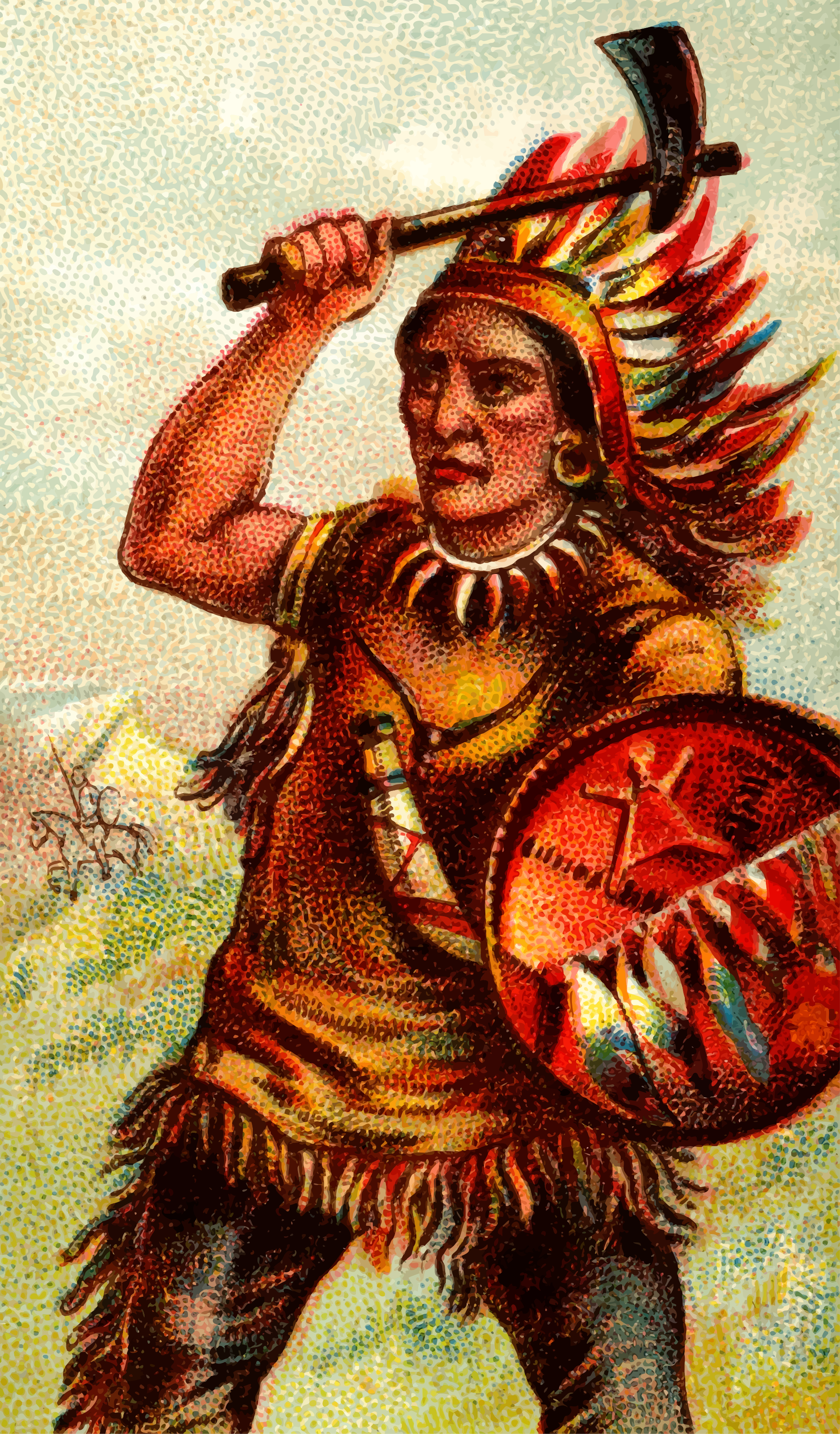 This features a Native American man dressed in traditional Indian garb, holding a tomahawk and a shield. He is standing on grass with his arms raised, ready for battle or display of strength. His attire includes a feathered headdress, adding to the authenticity of his appearance. The scene appears to be an illustration or painting, capturing the essence of Native American culture and history.