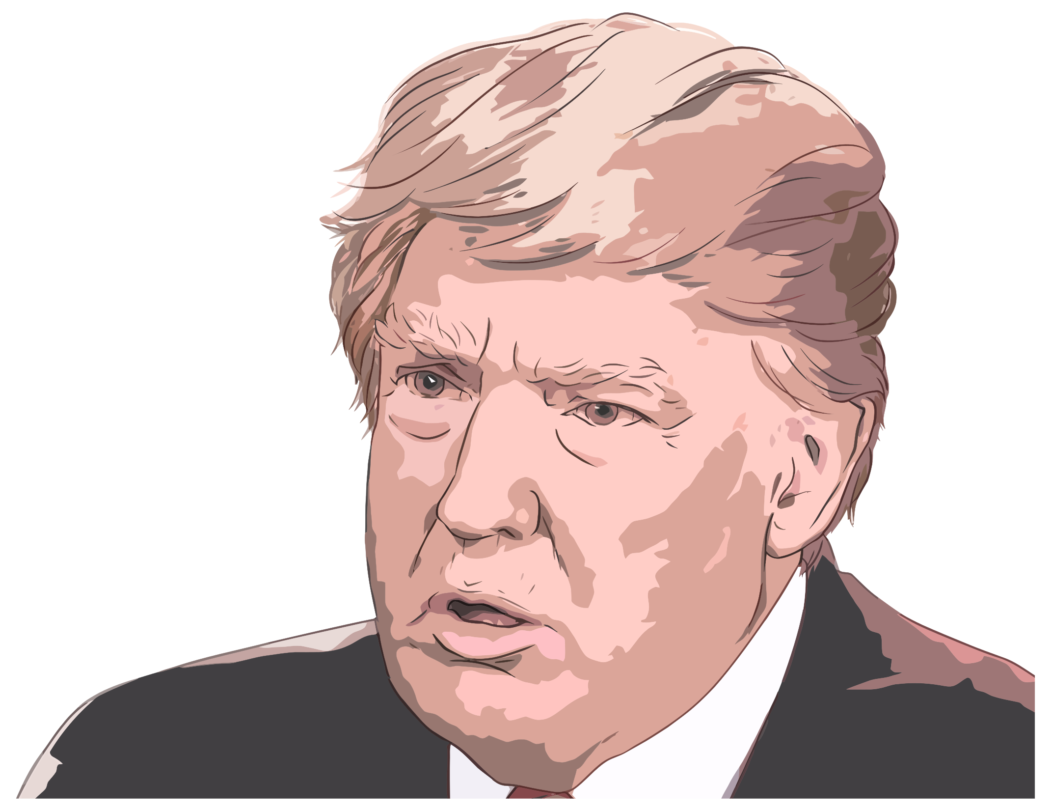 This features a drawing of Donald Trump, the former President of the United States. He is wearing a suit and tie, with his mouth open as if he's speaking or making an important announcement. His facial expression appears to be serious and focused on whatever topic he might be discussing. The drawing captures the essence of the man and his leadership style during his time in office.