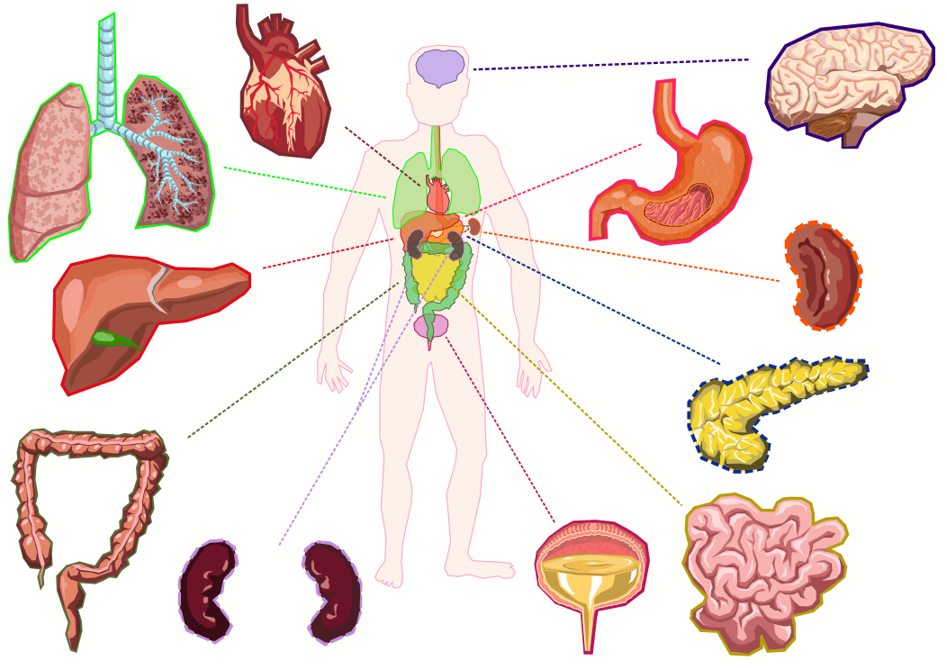 This is a diagram of the human body, showcasing various organs and their locations. In the center of the picture, there is an illustration of a person's torso with lines pointing to different parts of the body. These lines indicate the connections between the organs and their functions within the body. The image includes several organs such as the heart, lungs, stomach, liver, kidneys, brain, and intestines. Each organ is represented by a colorful illustration that highlights its importance in maintaining overall health and well-being.
