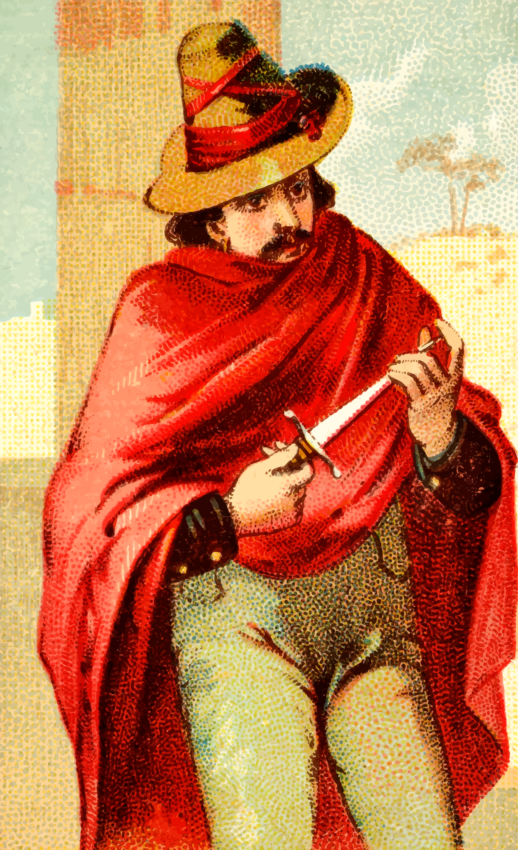 This features a man dressed in a red and white outfit, holding a sword. He is wearing a hat with a feather on it, adding to his distinctive appearance. The man appears to be the main focus of the scene, as he stands prominently in the foreground. The sword he holds is positioned close to him, emphasizing its importance in the image.