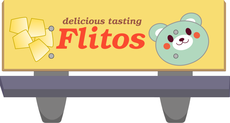 This features a yellow sign with a teddy bear on it, advertising Flitos. The sign is placed on top of a bench, which has wheels underneath to make it portable. The teddy bear appears to be the mascot for this imaginary product and adds a playful touch to the advertisement. The sign itself is quite large, covering most of the bench's surface area, making it an eye-catching display for passersby.