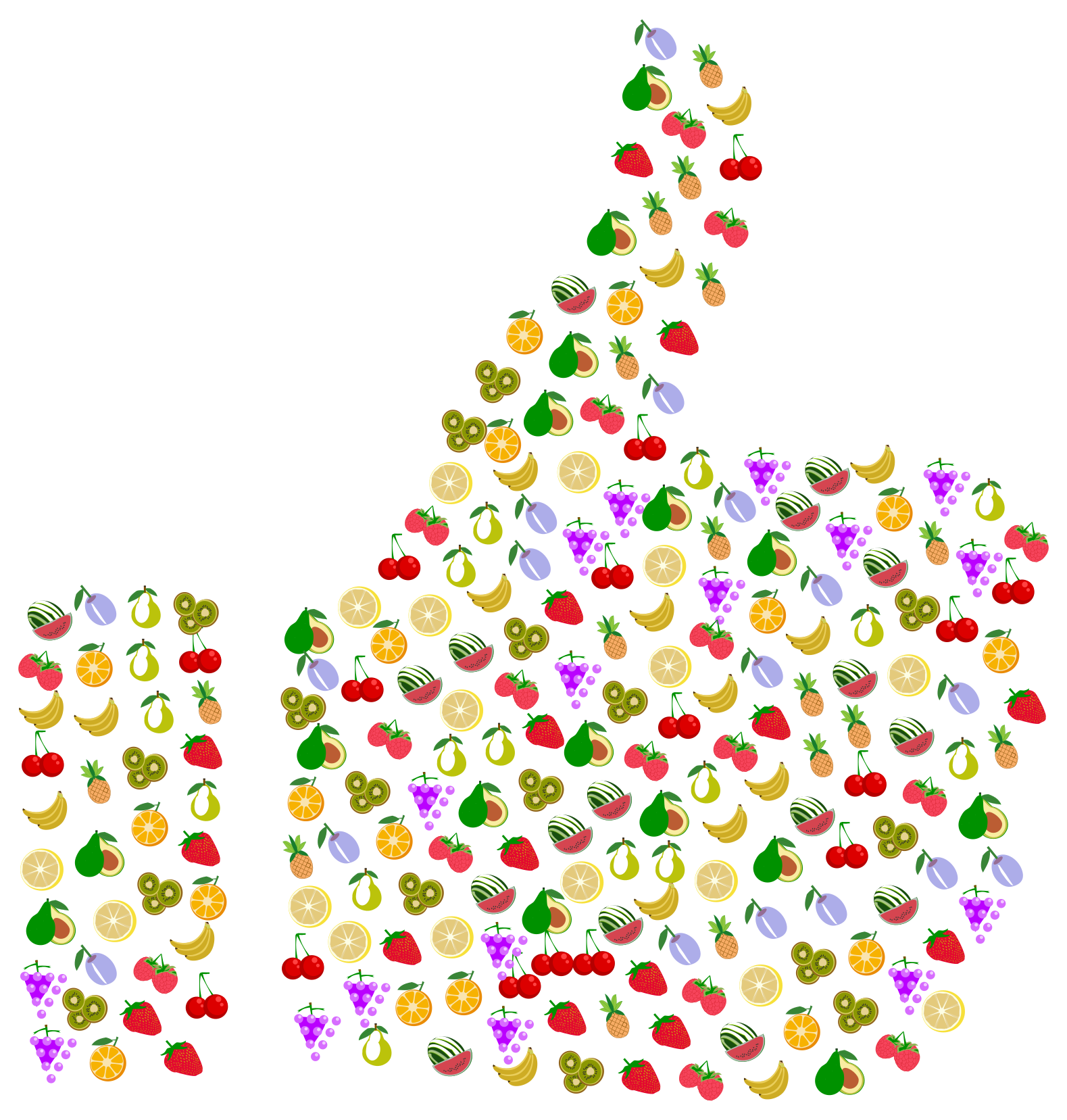 This features a large, colorful thumbs up sign made out of various fruits. The thumb is filled with an assortment of apples and oranges, creating a vibrant and lively scene. There are numerous apples scattered throughout the thumb, in different sizes and positions, while several oranges can be seen as well. This creative display of fruit creates a fun and engaging visual representation of a positive message.