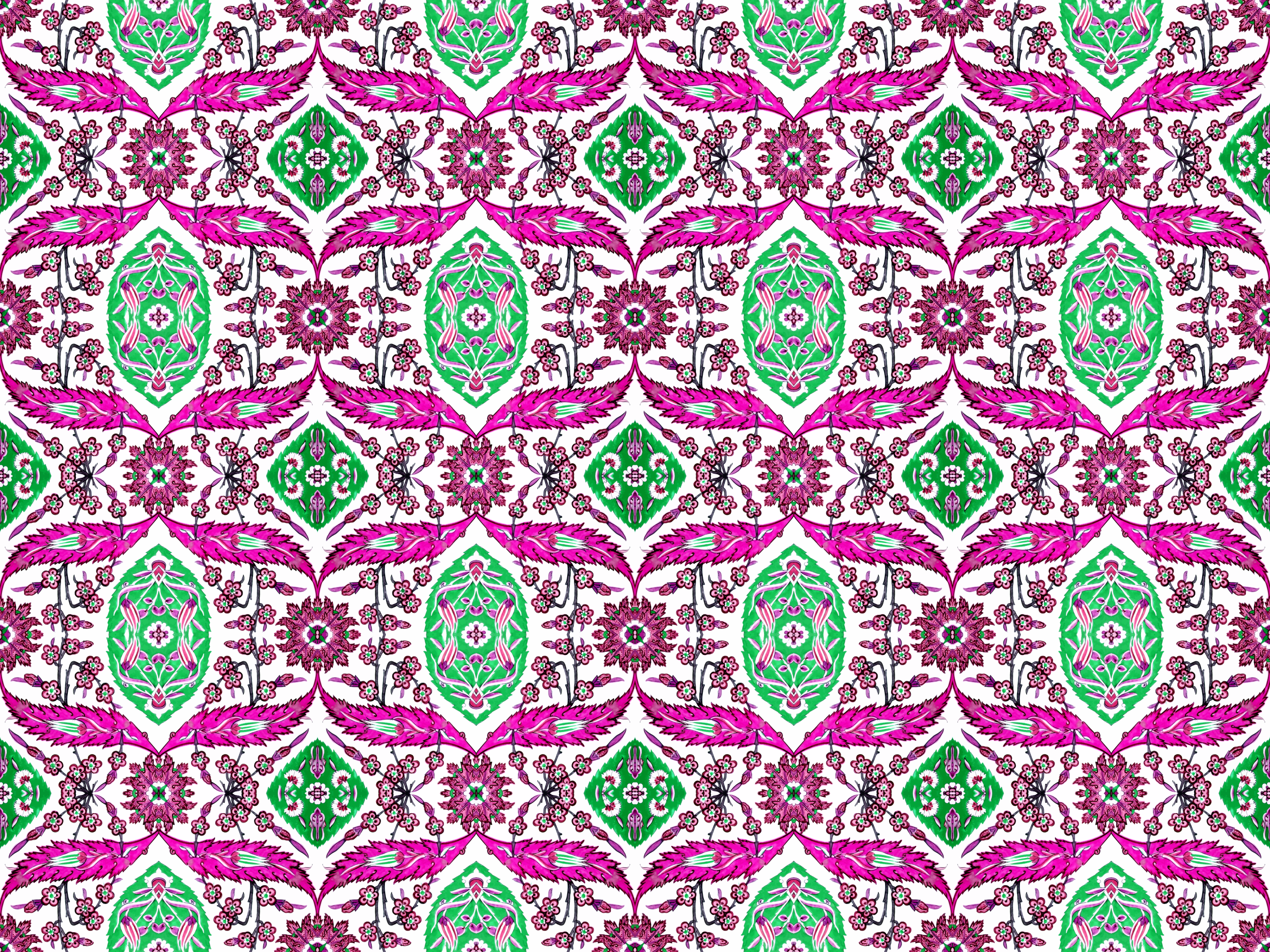 This features a pattern of green, pink and white flowers arranged in a geometric design. The flowers are placed in various positions throughout the pattern, creating an intricate and visually appealing display. The combination of these colors gives the pattern a vibrant and lively appearance. This design could be used for decorative purposes or as part of a larger artistic project.