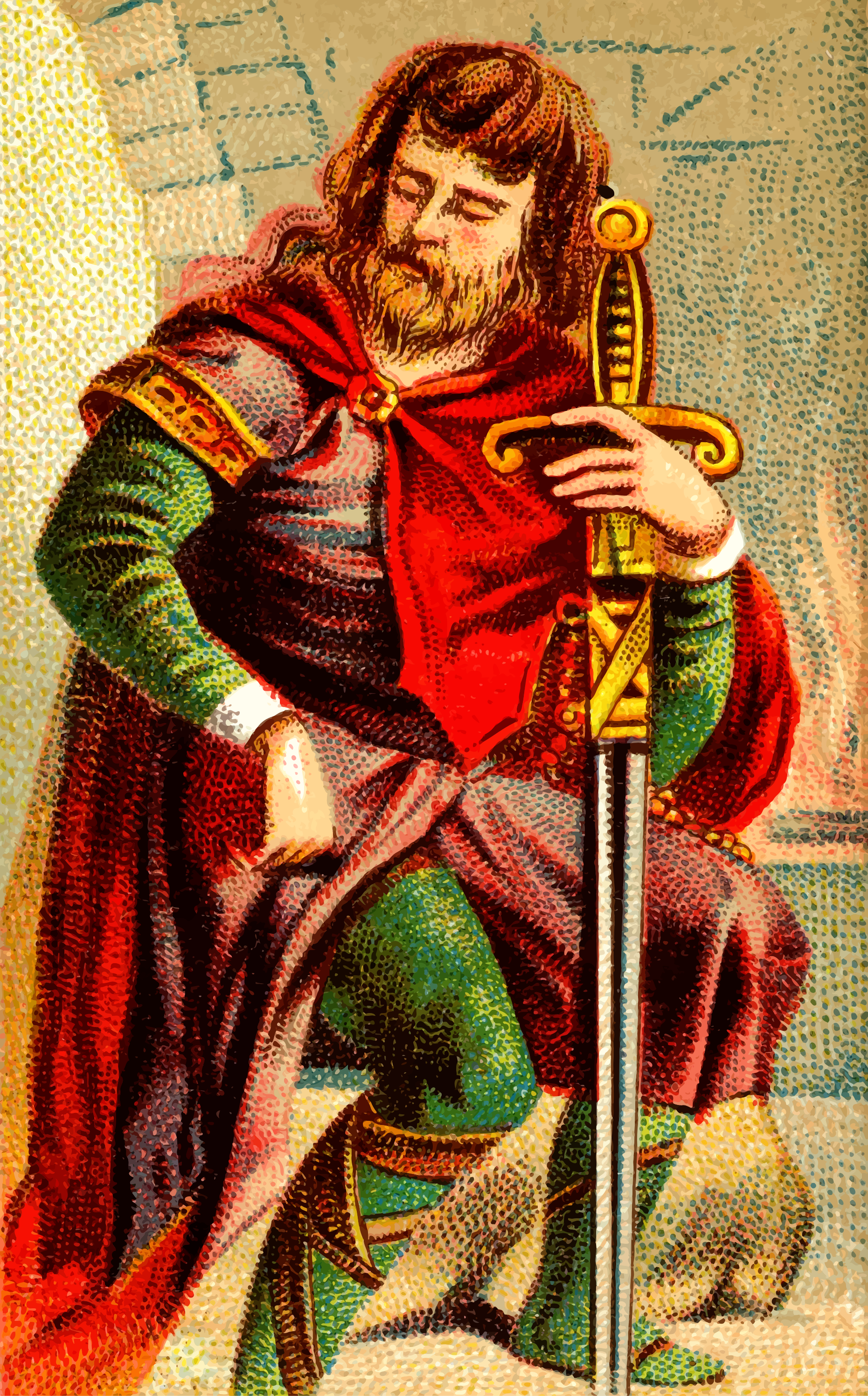 This features a man dressed in medieval armor, sitting on a chair with his sword resting on his shoulder. He appears to be wearing a red cape and has a beard. The scene is depicted in colorful detail, giving it an old-fashioned feel. The man's posture suggests that he might be taking a break or preparing for battle. The sword itself is quite large, adding to the overall atmosphere of the image.