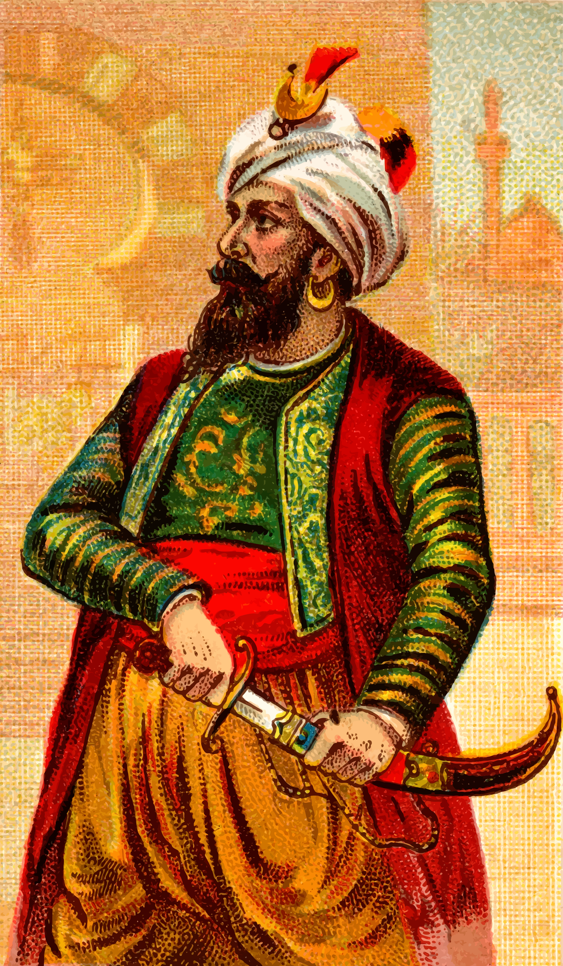 This features a man dressed in Middle Eastern garb, holding two swords. He is wearing a red and yellow outfit with gold trim, giving him an exotic appearance. His beard is long and curled, adding to his distinctive look. In the background, there are buildings visible, suggesting that this scene takes place in a city or urban setting. The man's attire and the presence of swords indicate that he might be a warrior or a leader from an ancient civilization.