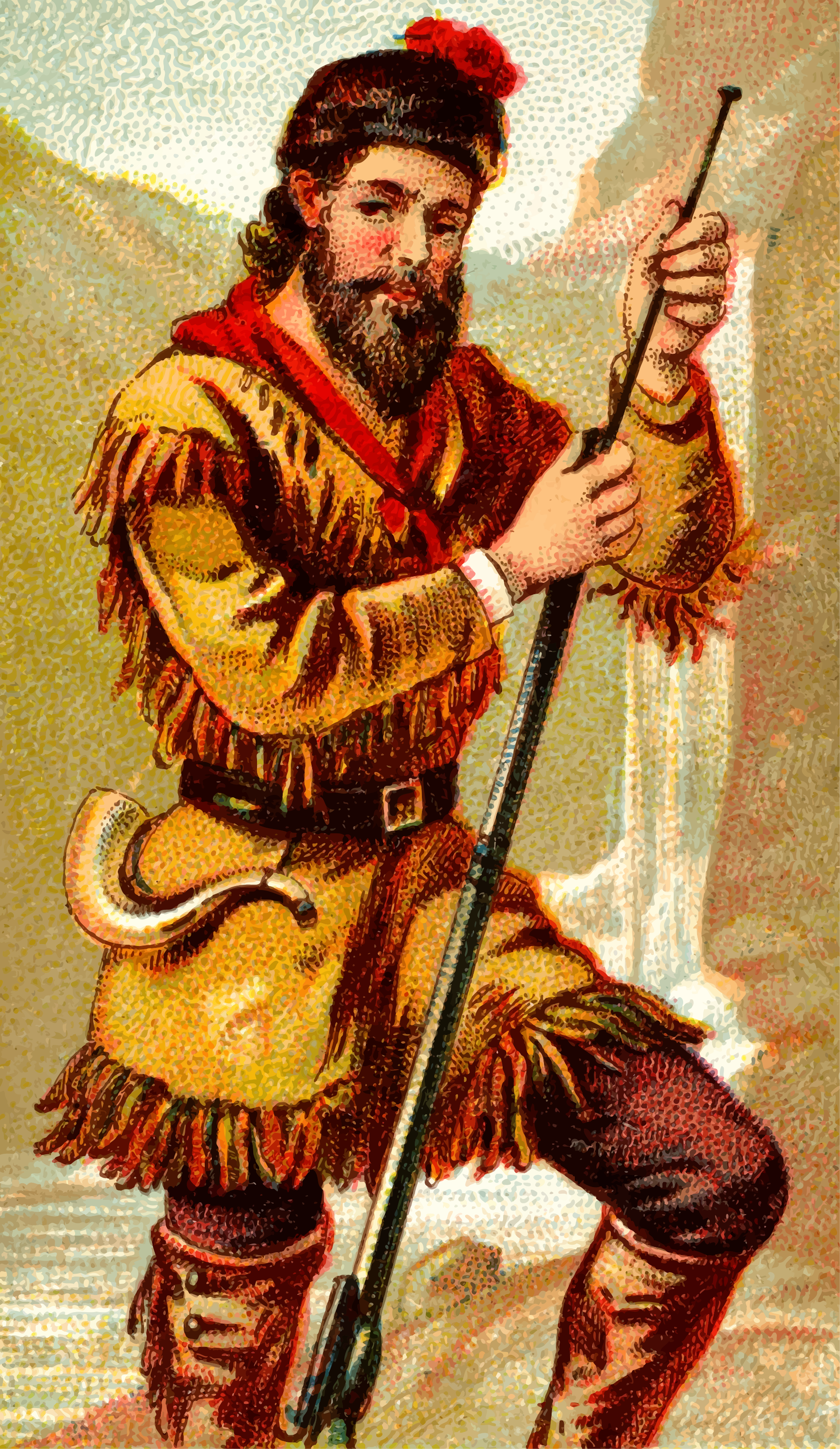 This features a man dressed in Native American clothing, holding a rifle and standing next to a waterfall. He appears to be an older gentleman with a beard and mustache, wearing a hat that complements his outfit. The man is positioned towards the left side of the scene, while the waterfall can be seen on the right side, creating a picturesque backdrop for this historical figure.