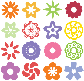This features a collection of sixteen different colored flowers, each with unique shapes and sizes. These flowers are arranged in a visually appealing manner, creating an attractive display. They can be used as icons or decorative elements for various purposes such as web design, graphic design, or even as part of a coloring book. The variety of colors and designs makes this collection versatile and suitable for diverse applications.