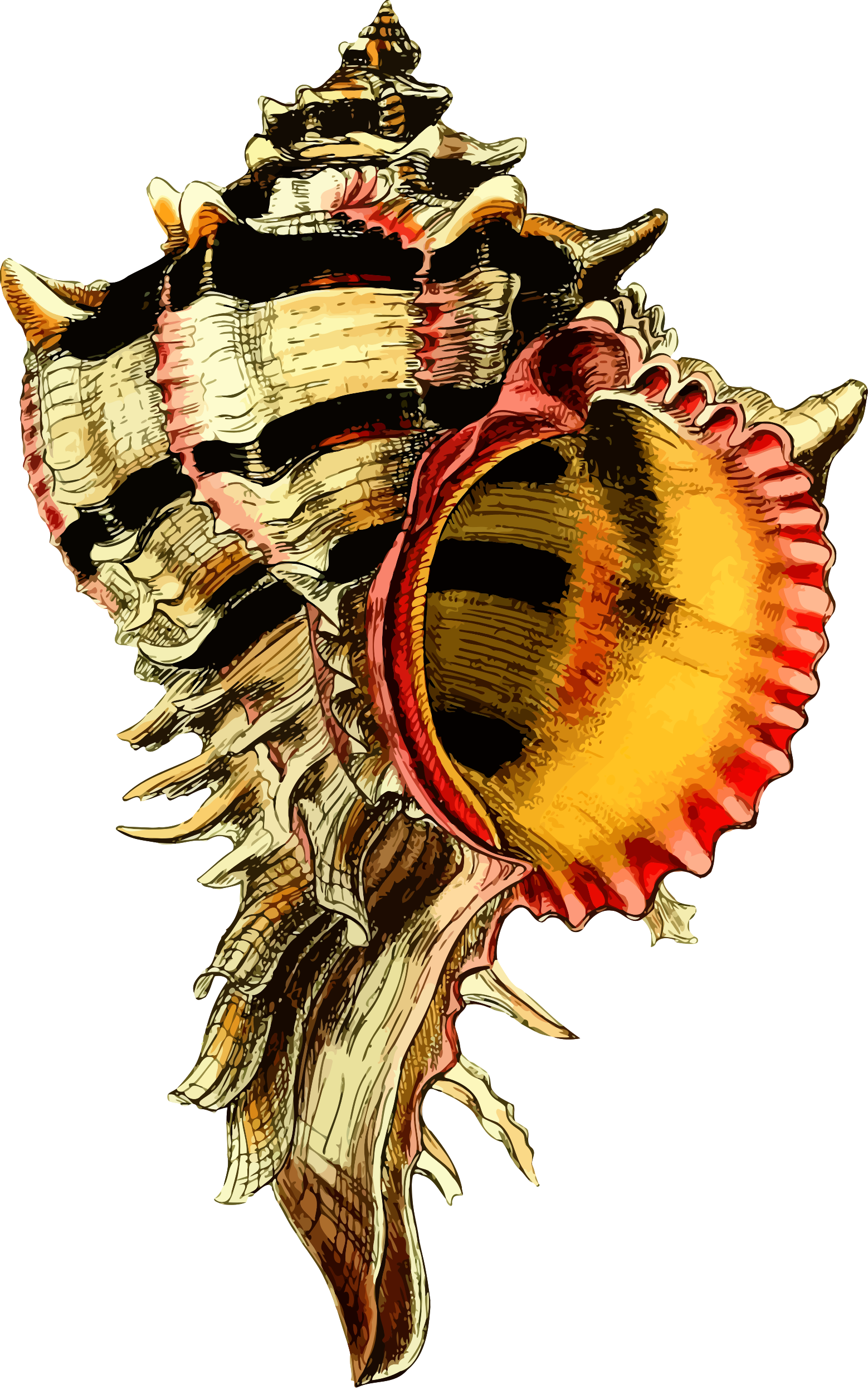 This features a beautifully drawn shell with an intricate design. It is a close-up of the shell, showcasing its unique and detailed structure. The shell has a combination of red and yellow colors, adding to its visual appeal. This artistic representation of a shell could be from a book or drawing, capturing the beauty of nature in a creative way.